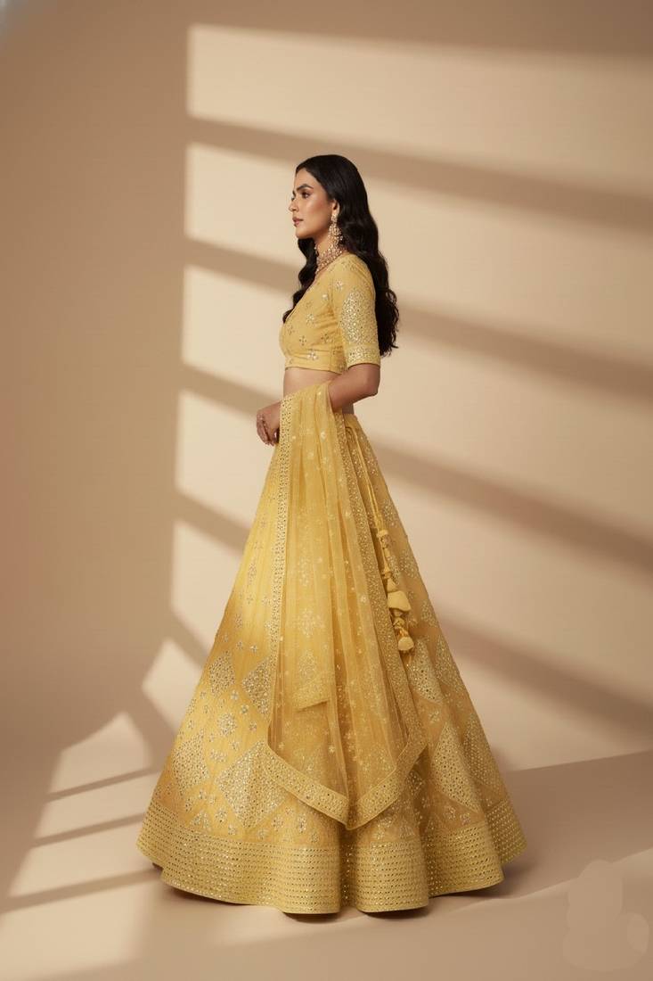 Yellow thread, foil mirror organza lehenga choli with dupatta