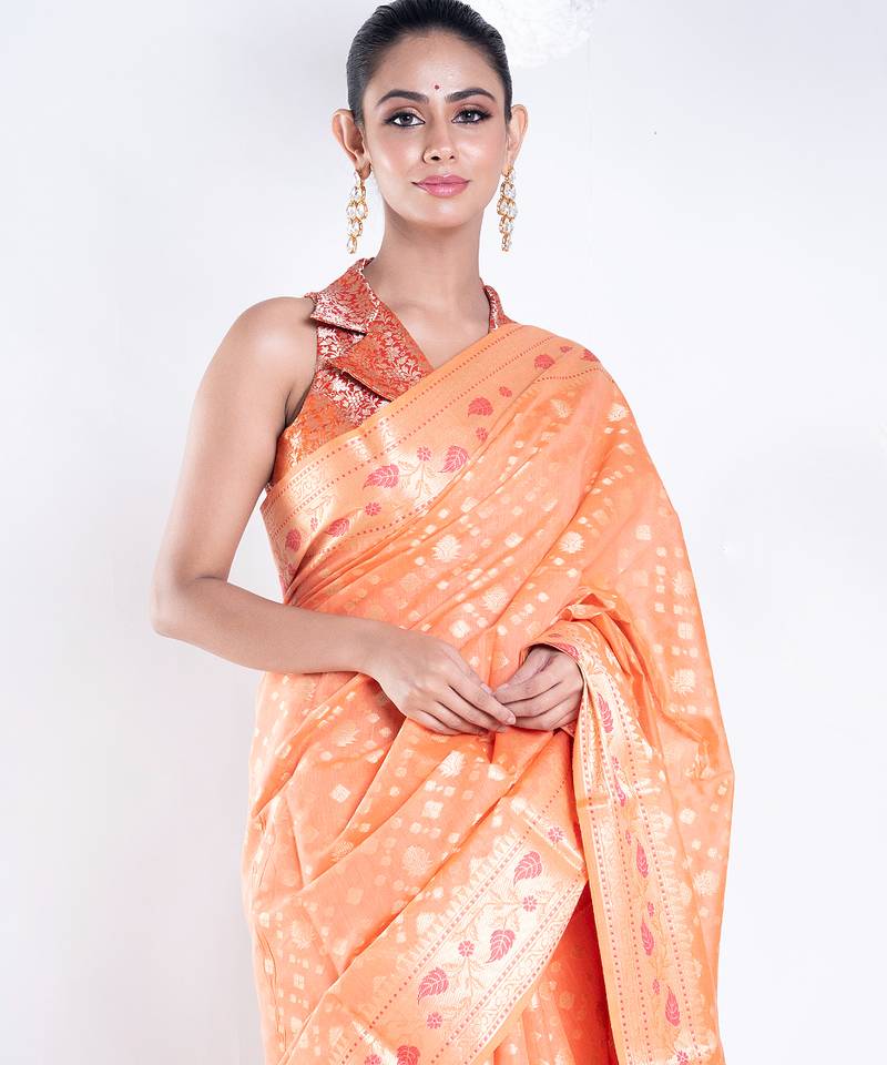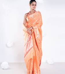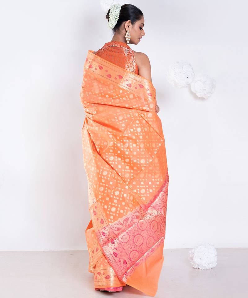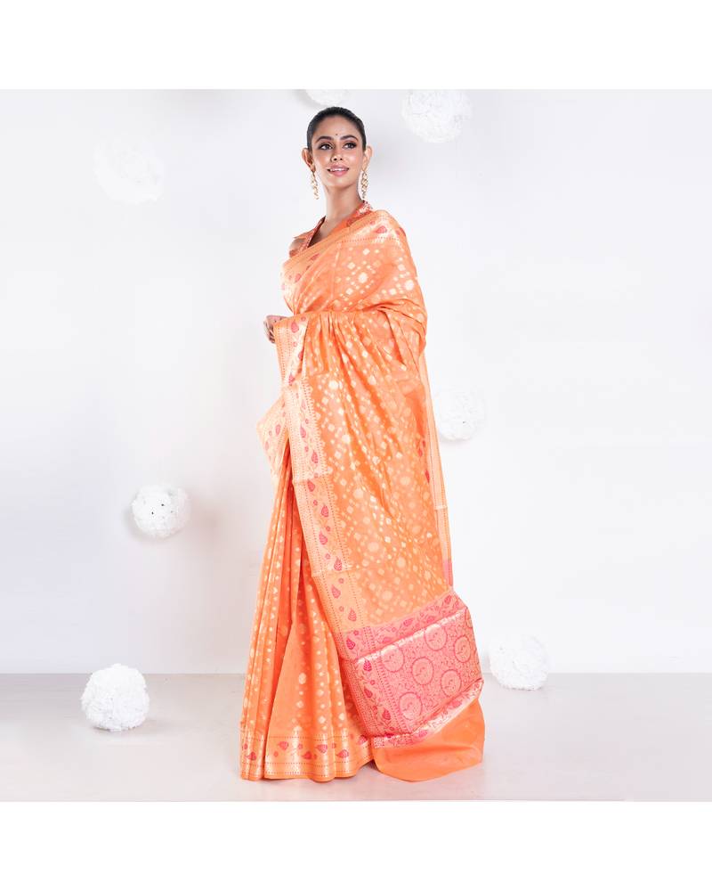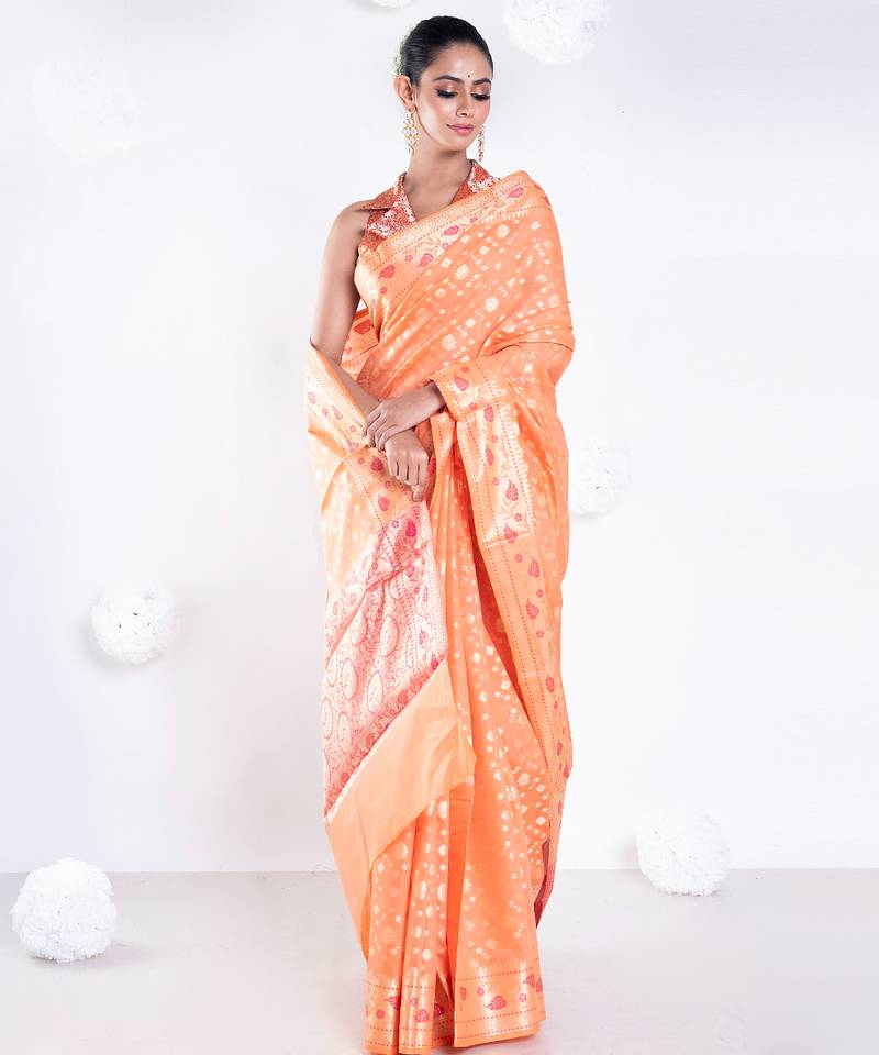 Product Name Banarasi Kora Organza Saree In Orange Color With Golden Booti And Border