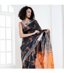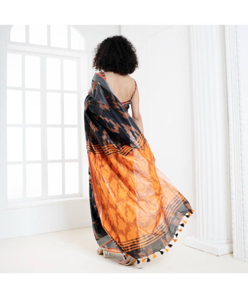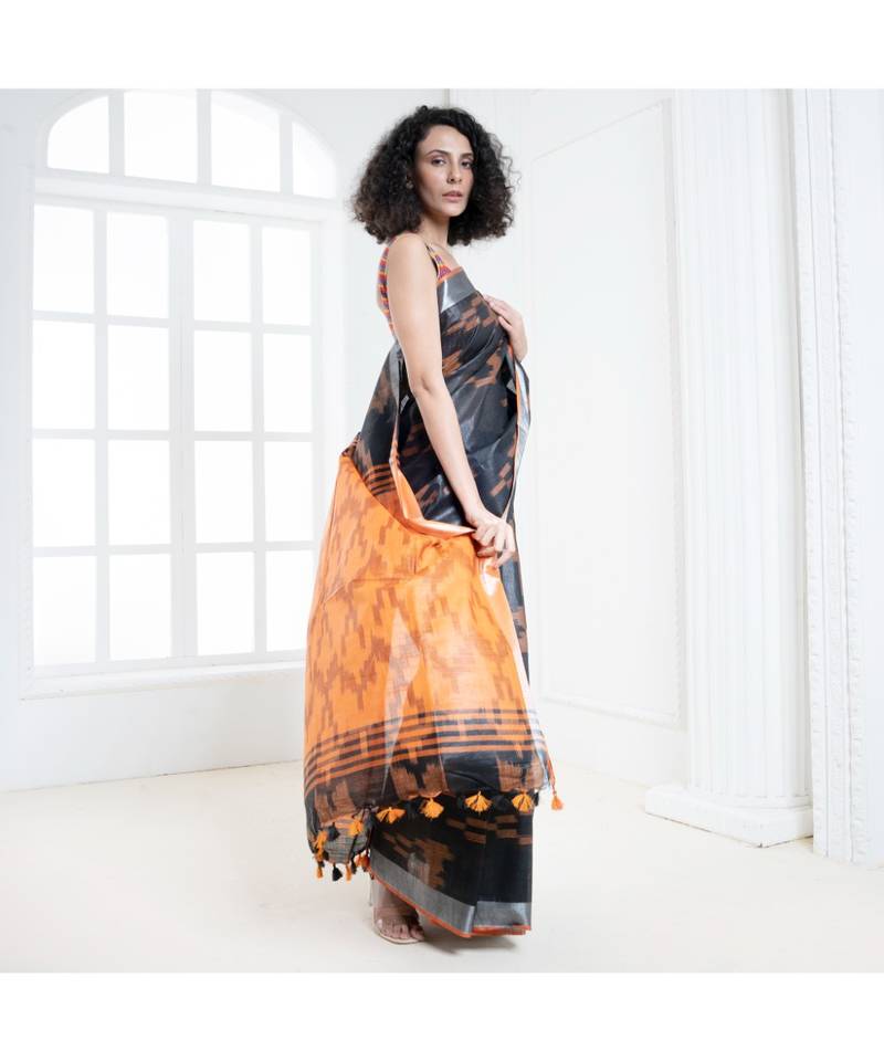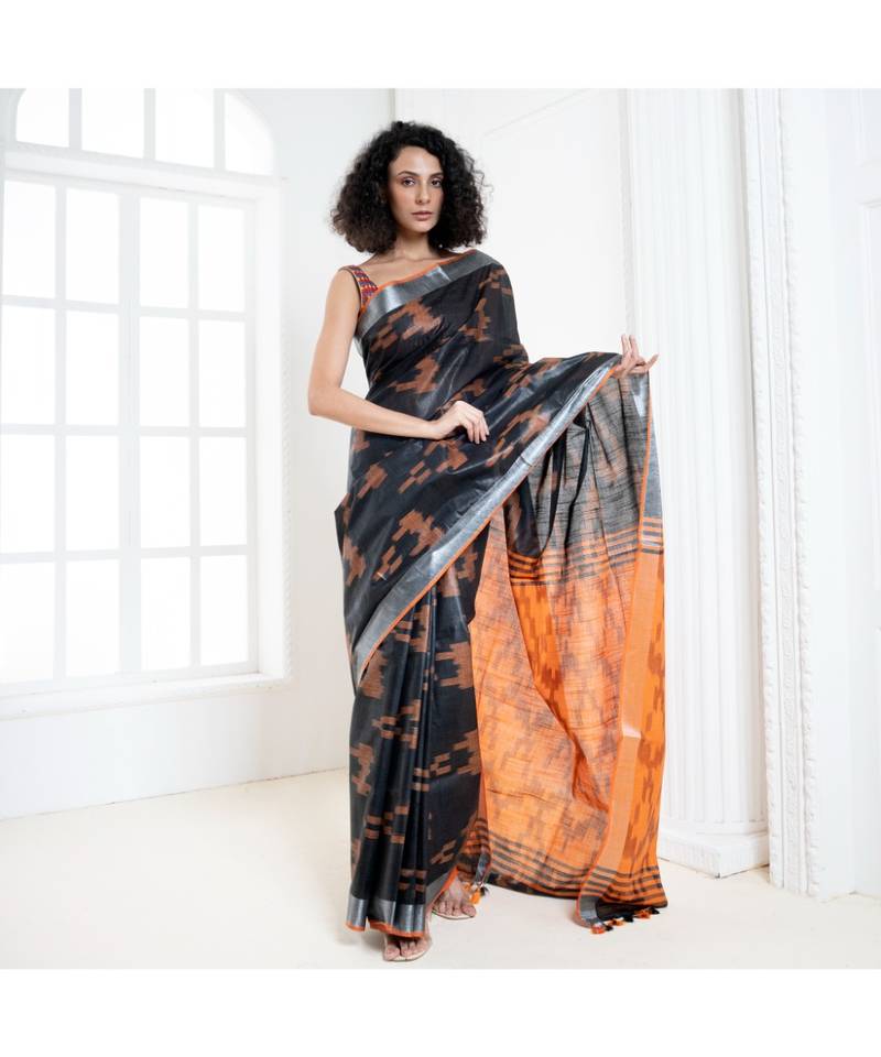 | Product Name | Black Blended Cotton Ikkat Saree With Orange Motifs And Pallu | |
