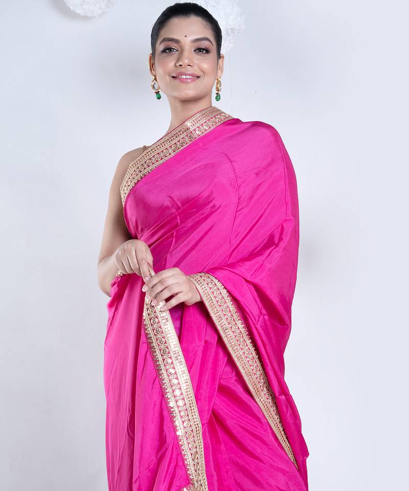 Habutai silk blend saree with pink color with golden embroidered border
