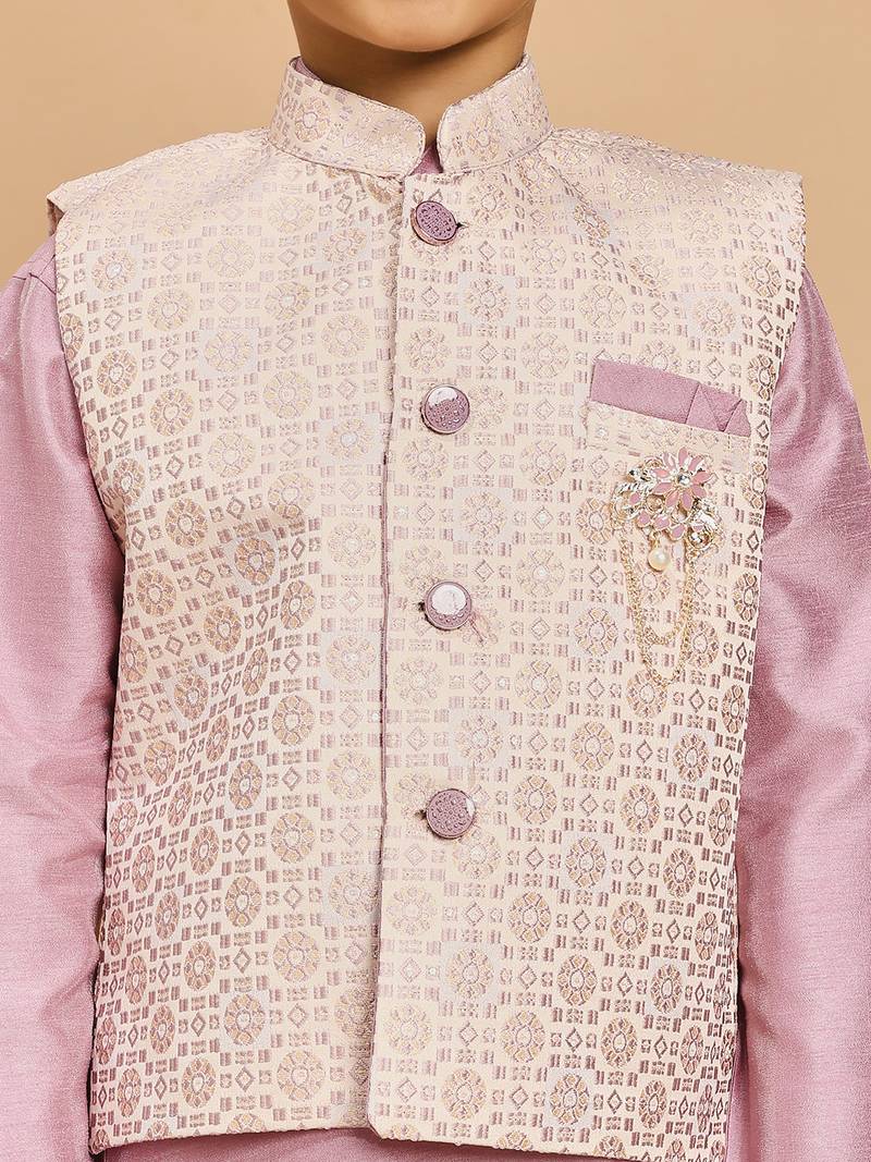 Boys lilac cotton silk kurta & pyjama set with jacquard nehru jacket