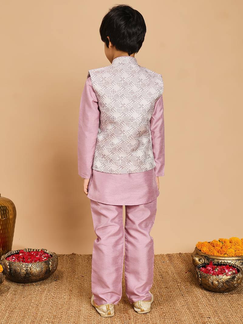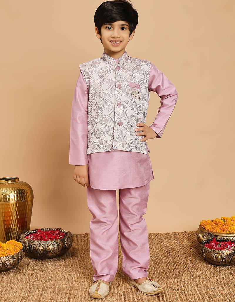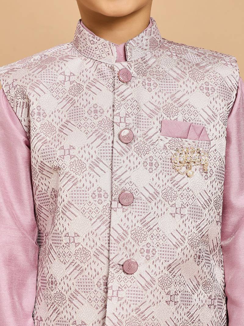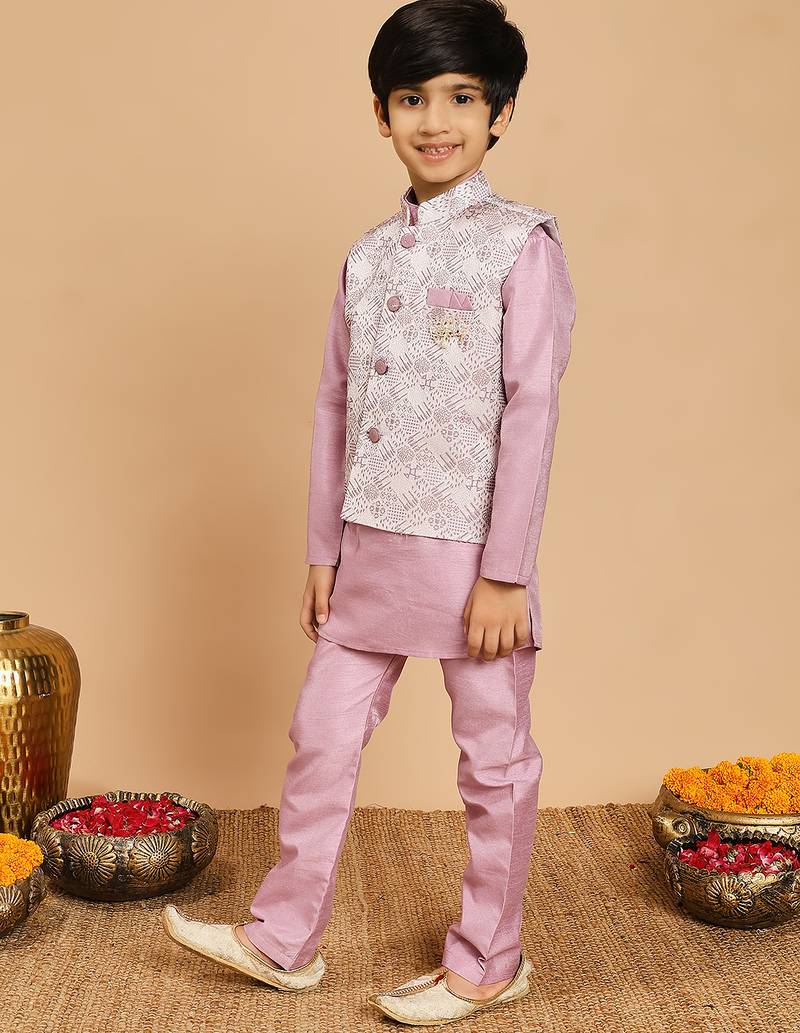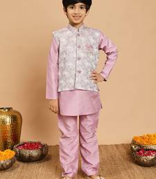 Boys lilac cotton silk kurta & pyjama set with jacquard cotton silk kurta & pyjama set with jacquard nehru jacket