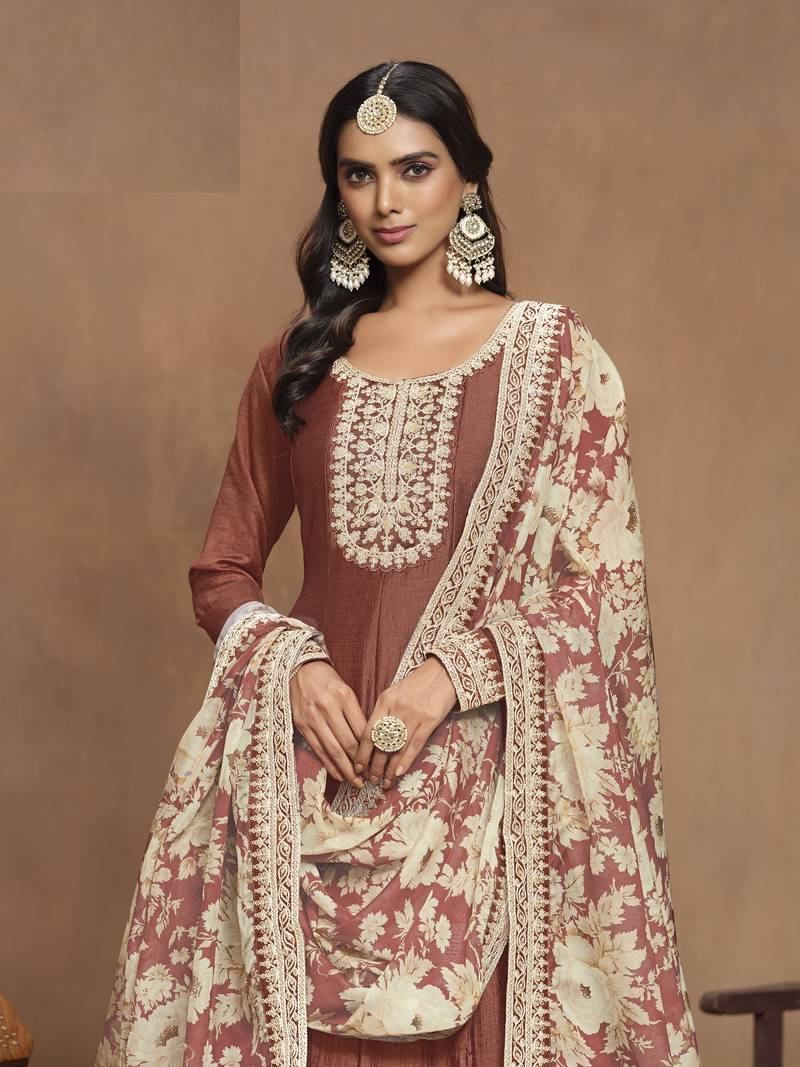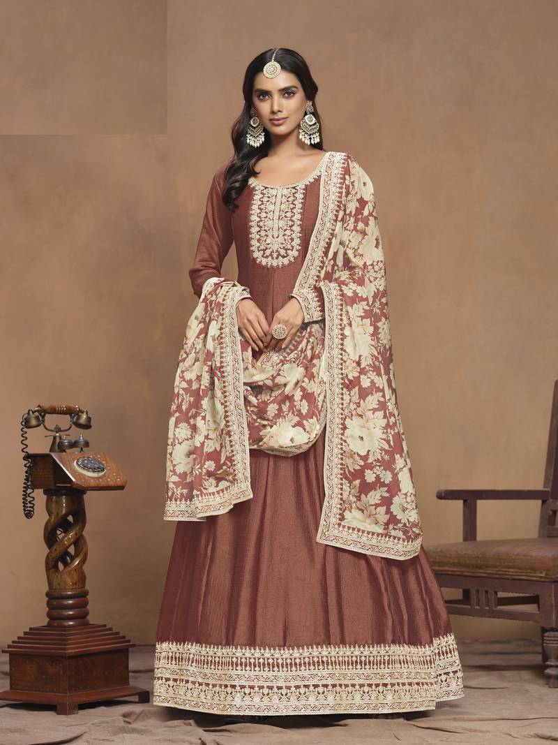 | Product Name | Copper Brown Embroidered Art Silk Anarkali With Organza Dupatta | |