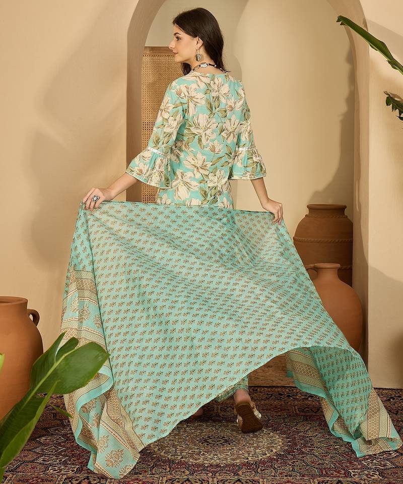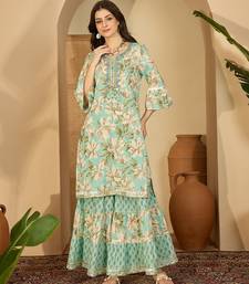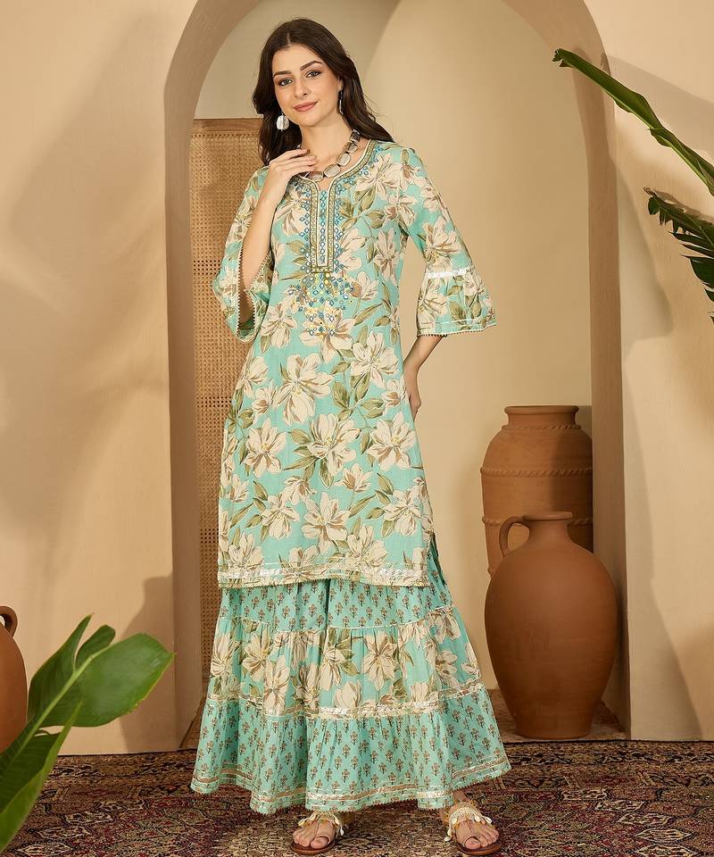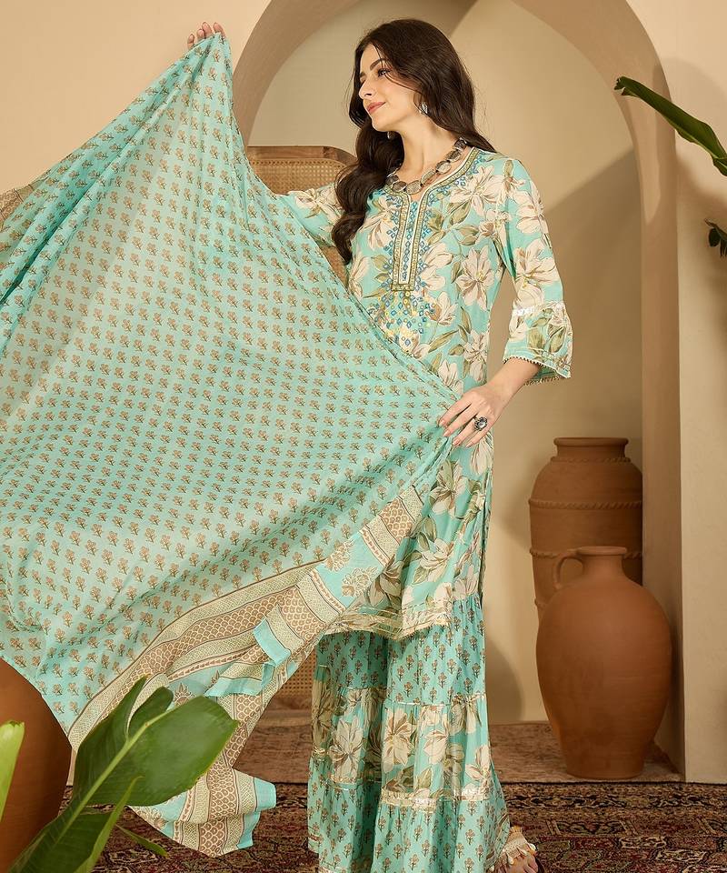 | Product Description | Green Floral Printed Kurta Sharara Dupatta Set With Delicate Embroidery On Neckline And Flared Sleeves. Paired With Matching Printed Sharara Pants And A Soft Printed Dupatta For A Graceful Festive Look. |