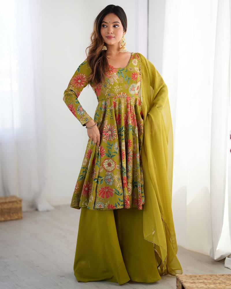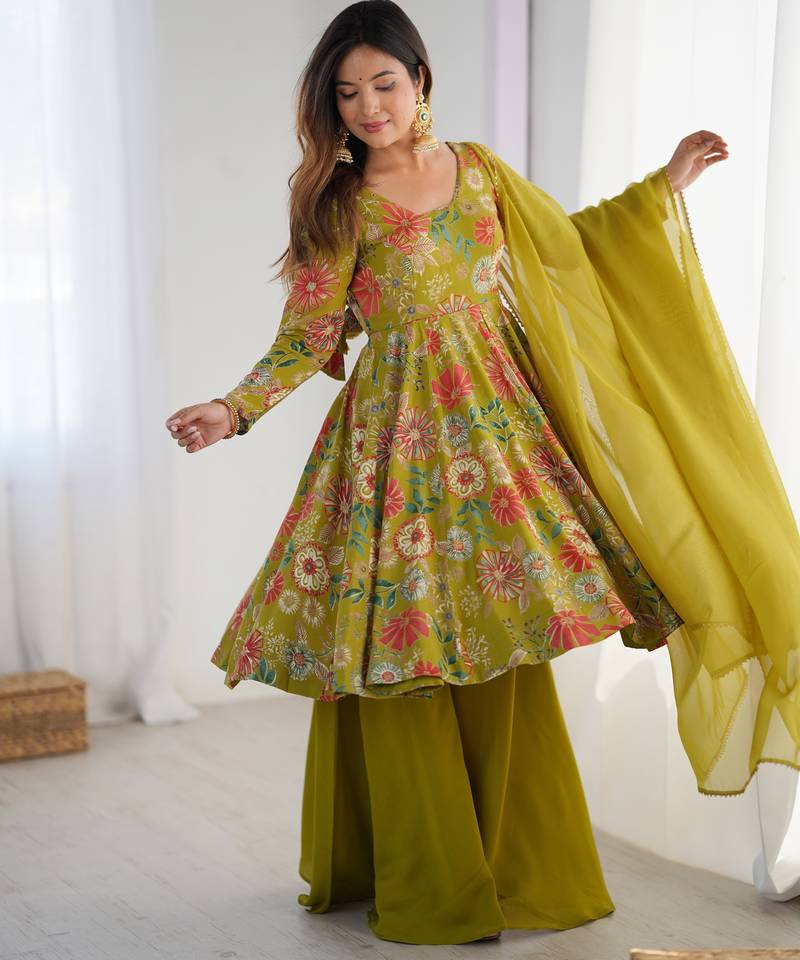 Mehndi color roman silk discharge printed plazzo suit stitched