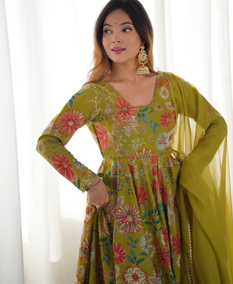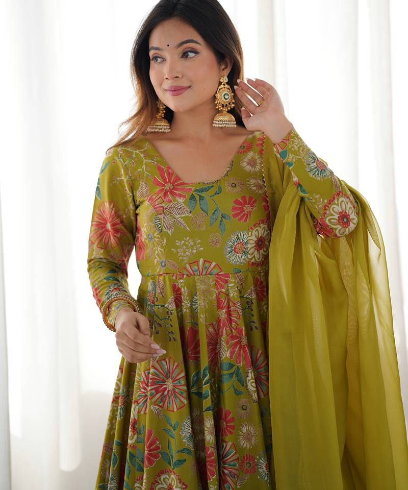 Mehndi color roman silk discharge printed plazzo suit