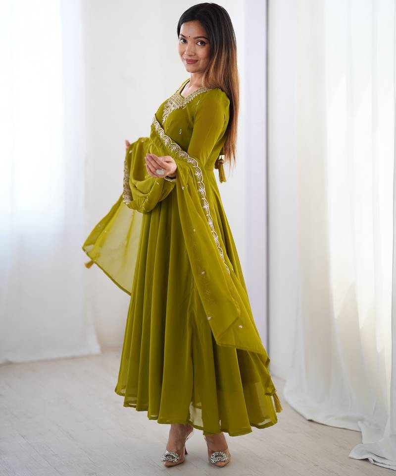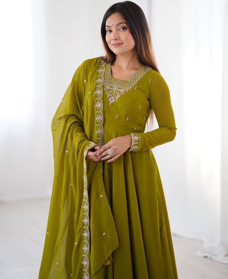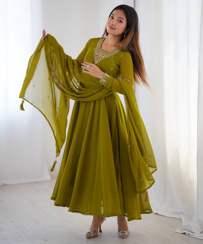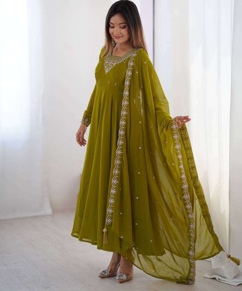 Mehndi green designer embroidery beads and zari work gown with dupatta stitched