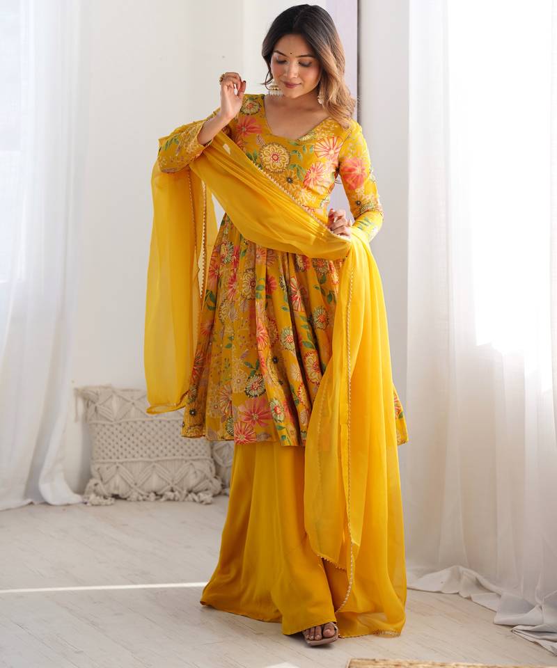 | Product Description | Elegant Mustard Color Raman Silk Palazzo Suit Featuring Intricate Discharge Printing, A Stylish Kurti, Flared Palazzo Pants, And A Matching Dupatta. Perfect For Festive Occasions And Cultural Celebrations. |