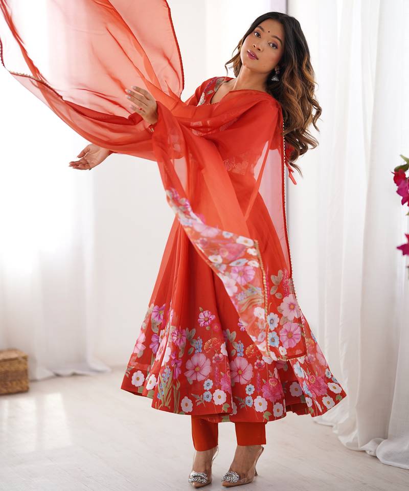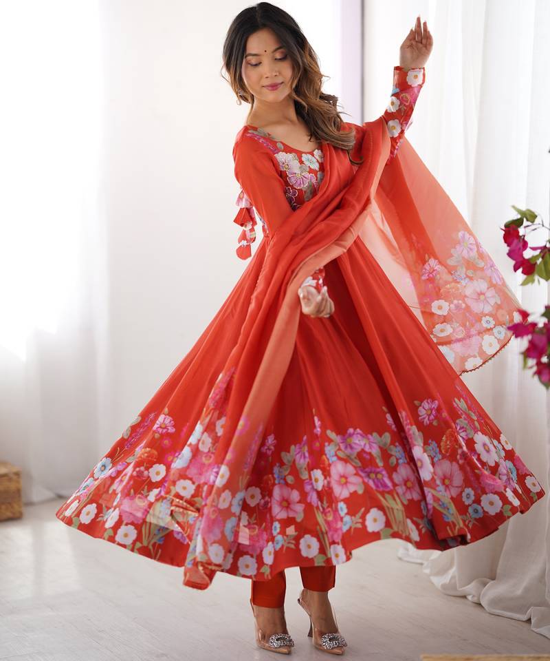 Brighten Up Your Festive Wardrobe With This Sweet Orange Organza Silk Anarkali Suit, Featuring Elegant Floral Prints And Delicate Badla Zari Work. The Rich 4 Meter Flair And 48 Inch Length Give The Kurti A Graceful And Flowing Silhouette That Flatters Every Movement.