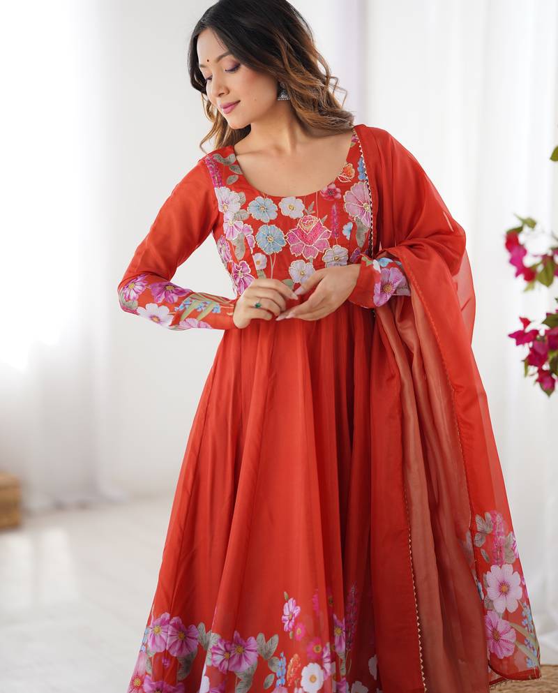 Red embroidered organza anarkali set with dupatta stitched