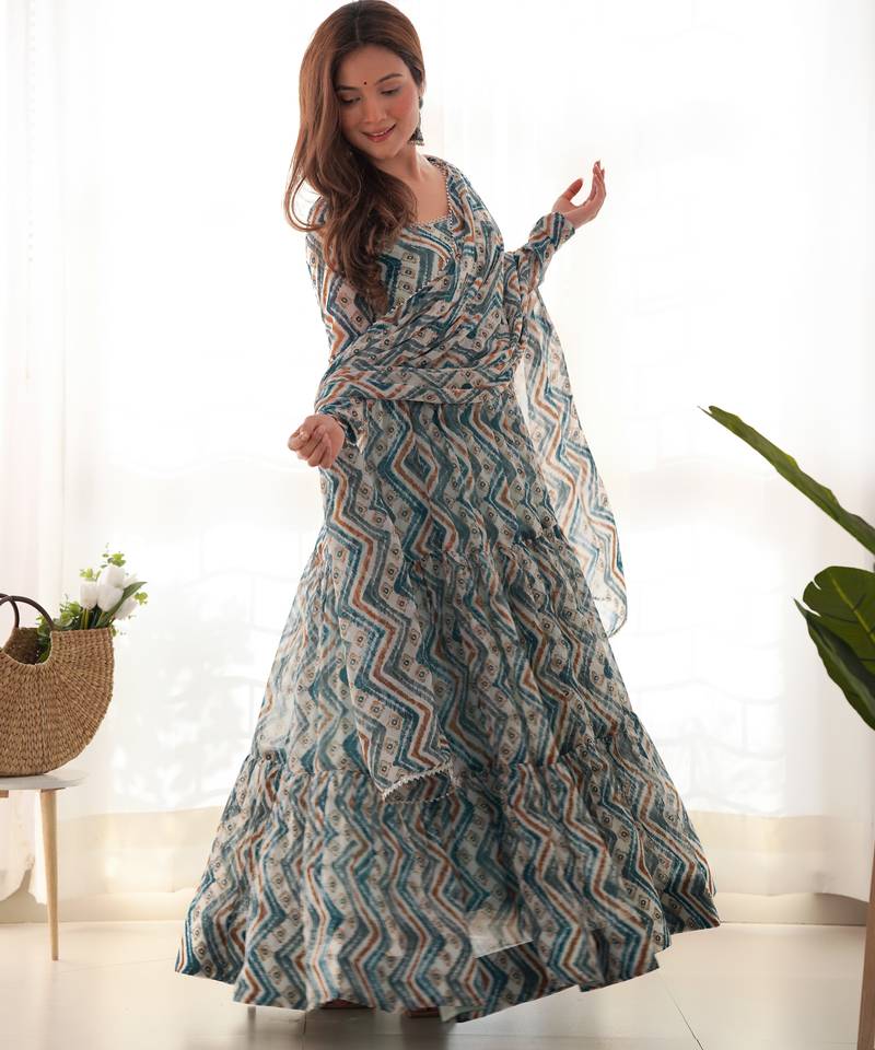 Indulge In The Elegance Of Timeless Indian Fashion With Our Sky Blue Printed Faux Georgette Anarkali Set.
