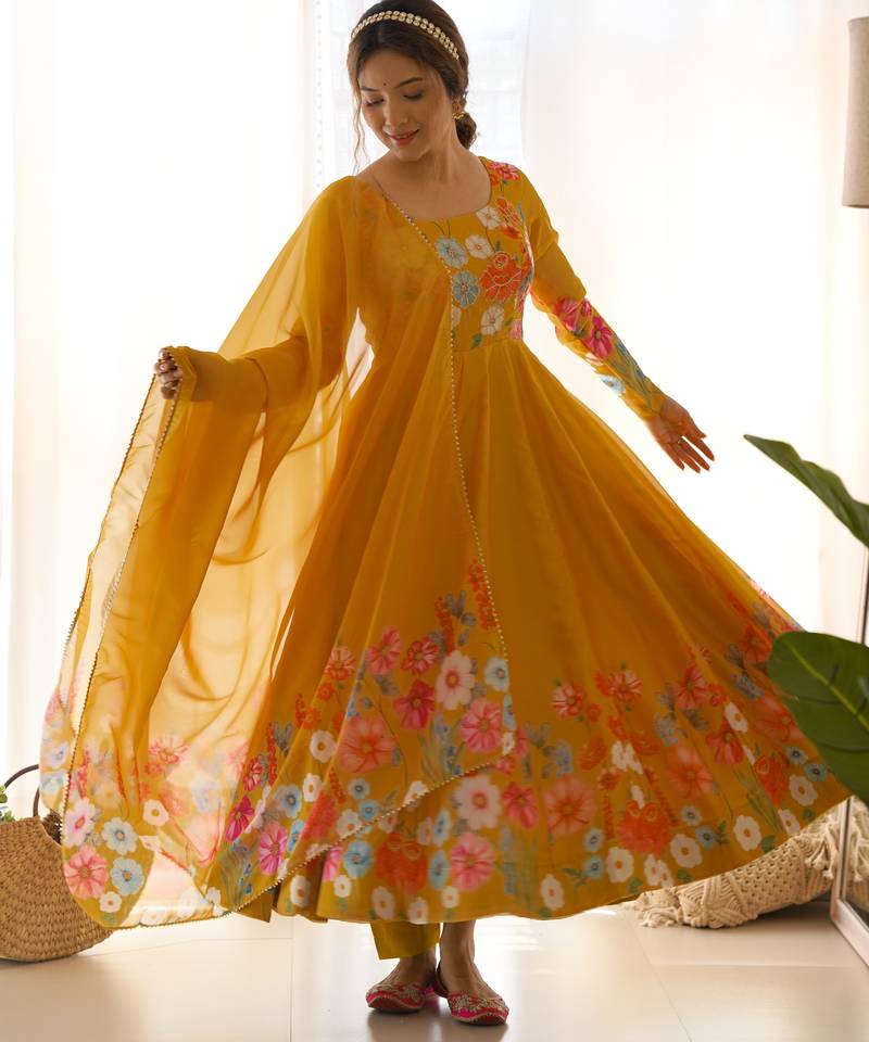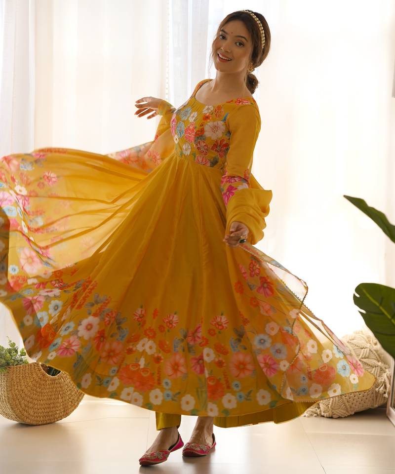 Brighten Up Your Festive Wardrobe With This Radiant Yellow Color Organza Anarkali Suit, A Perfect Blend Of Tradition And Elegance. Adorned With Charming Floral Print Work And A Touch Of Zari Border Detailing, This Outfit Exudes A Warm, Vibrant Energy Ideal For Celebratory Occasions.