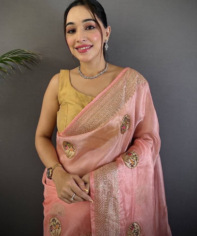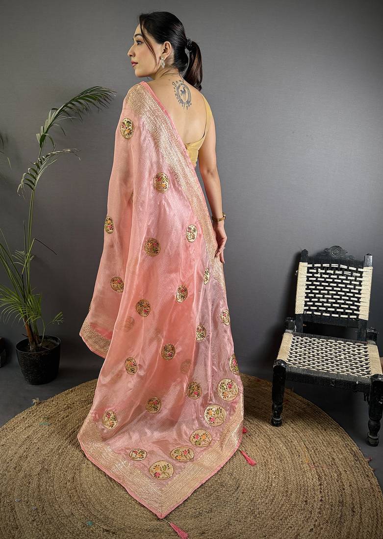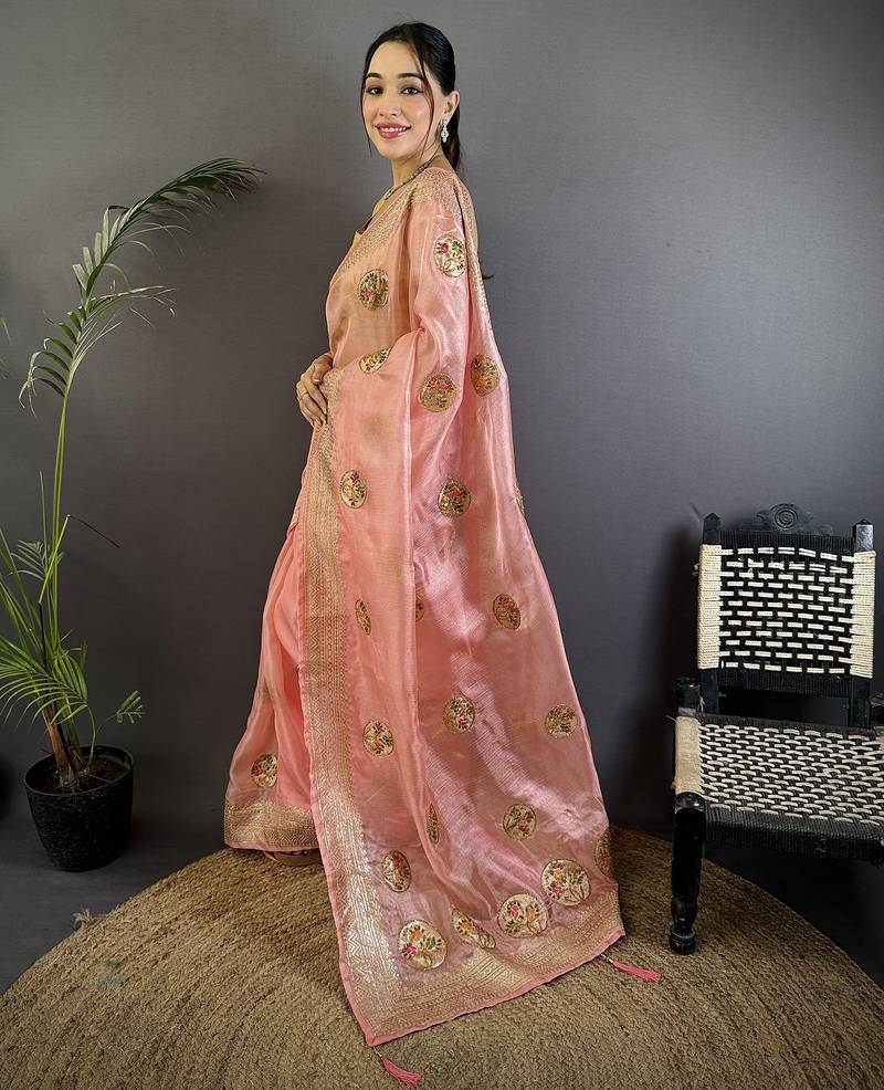 Baby pink organza silk blend handloom banarasi saree with heavy khatali butta work