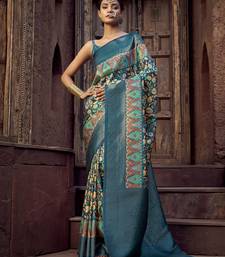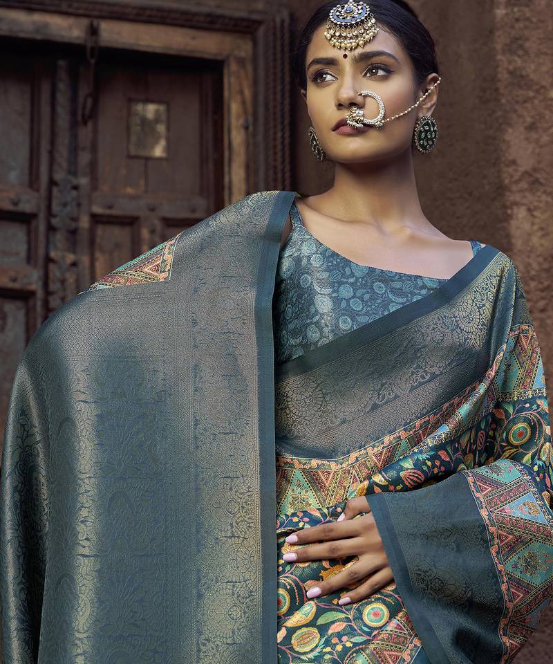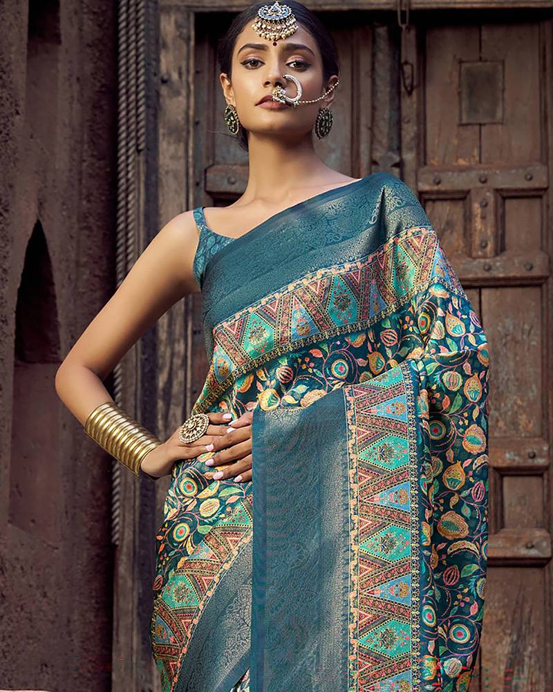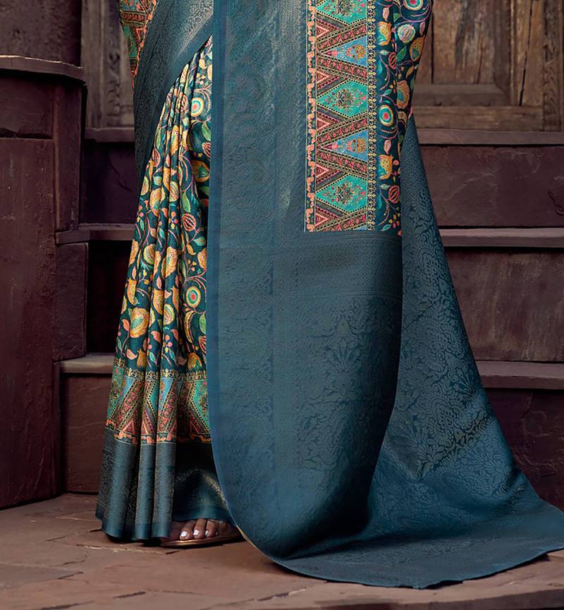 Blue jacquard p v silk blend digital floral print zari weaving bollywood saree