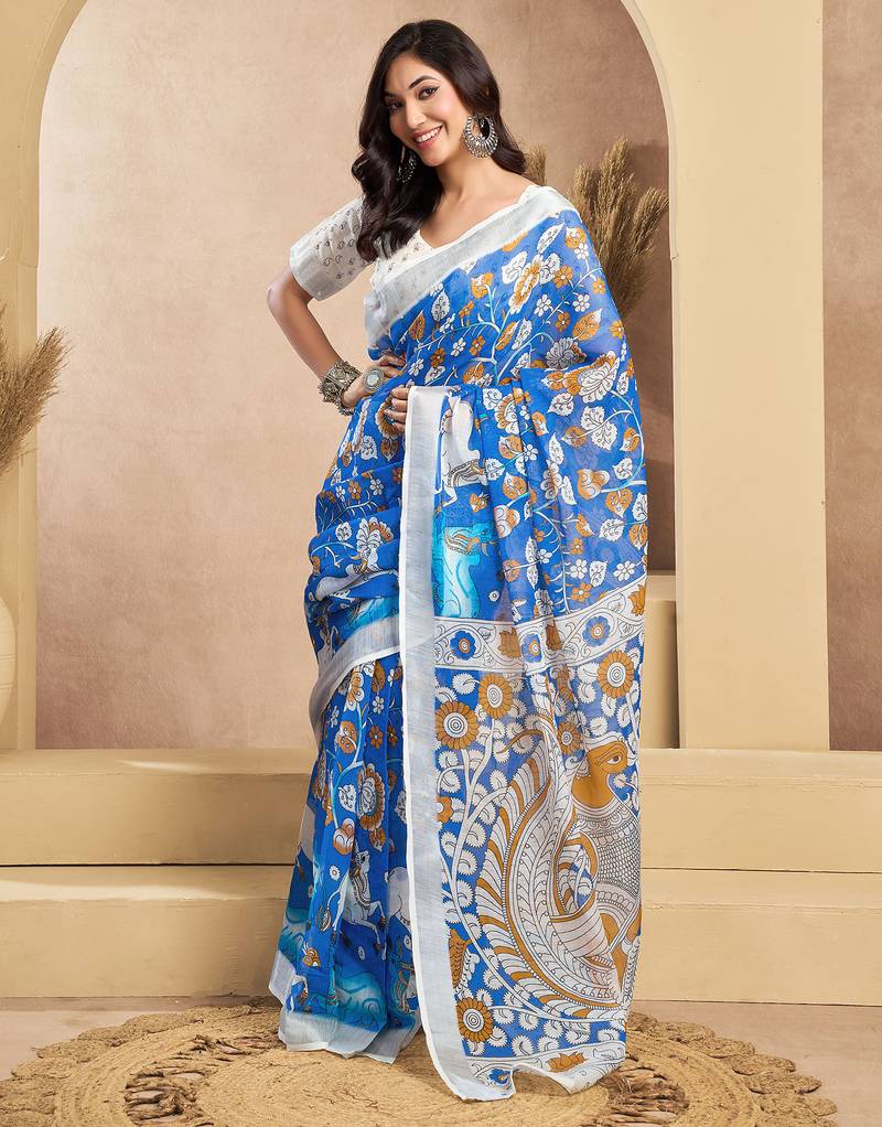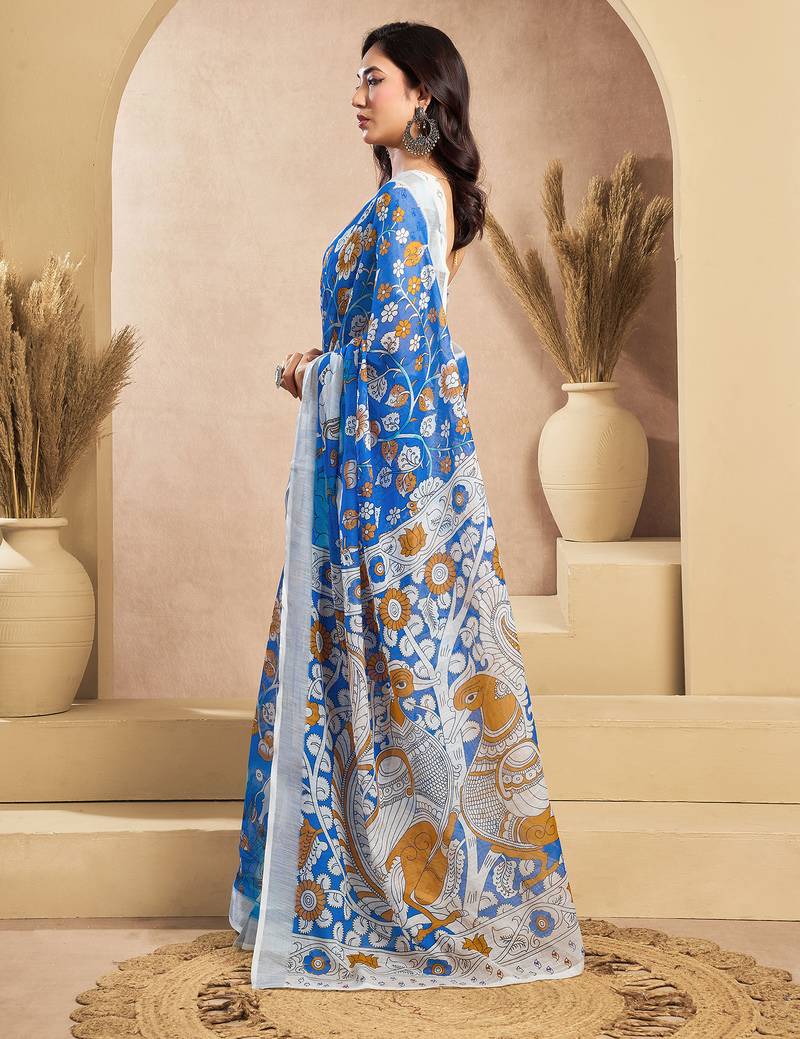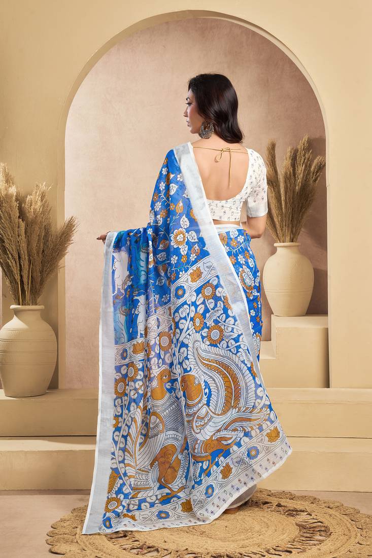| Product Name | Blue & White Linen Kalamkari Printed Ready To Wear Saree | |