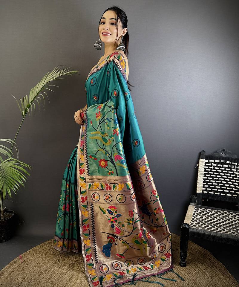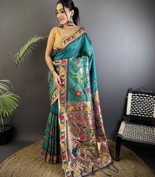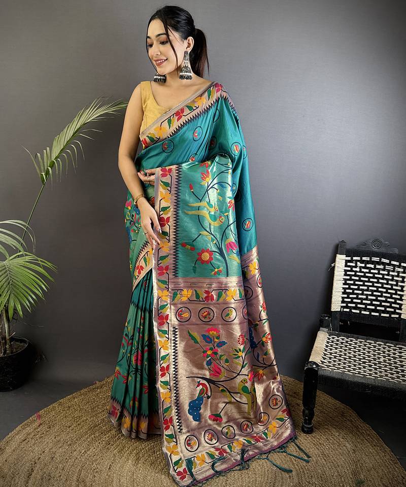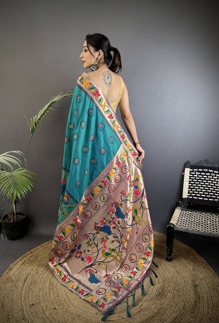 Cyan blue soft silk blend paithani meenakari zari weaving saree