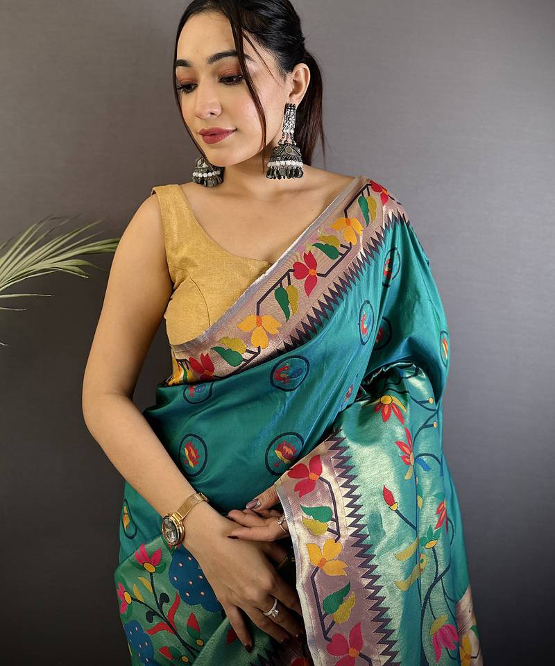 | Product Description | Step Into Elegance With The Elora Cyan Blue Soft Silk Paithani Meenakari Zari Weaving Saree A True Masterpiece For Women Who Love Ethnic Wear With A Modern Twist. Crafted With Premium Soft Silk, This Saree Features Intricate Meenakari Zari Work That Shimmers With Every Step, Making It A Trending And Top Ranking Choice For Festive Celebrations, Weddings, And Special Occasions. Its Vibrant Cyan Blue Hue Effortlessly Complements All Skin Tones, Ensuring You Stand Out In Style While Embracing The Rich Tradition Of Paithani Weaving.