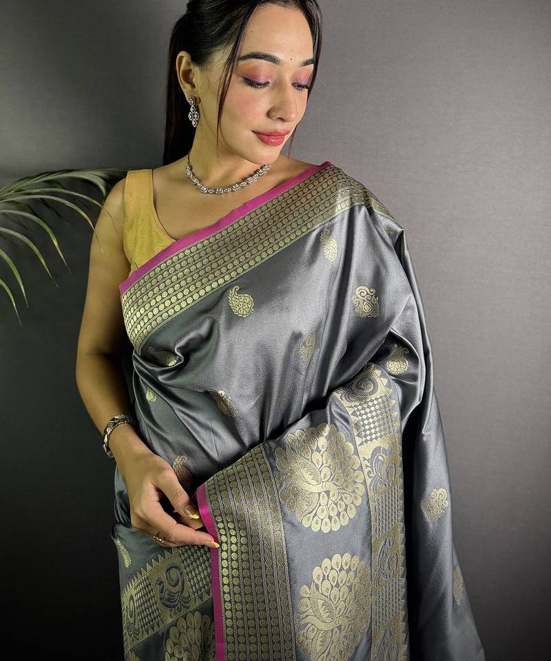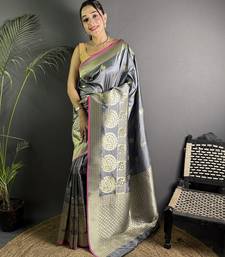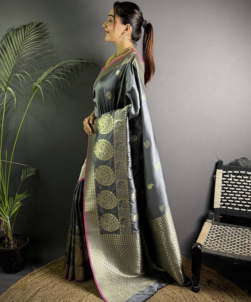 Dark grey soft lichi silk blend golden zari paisley banarasi saree