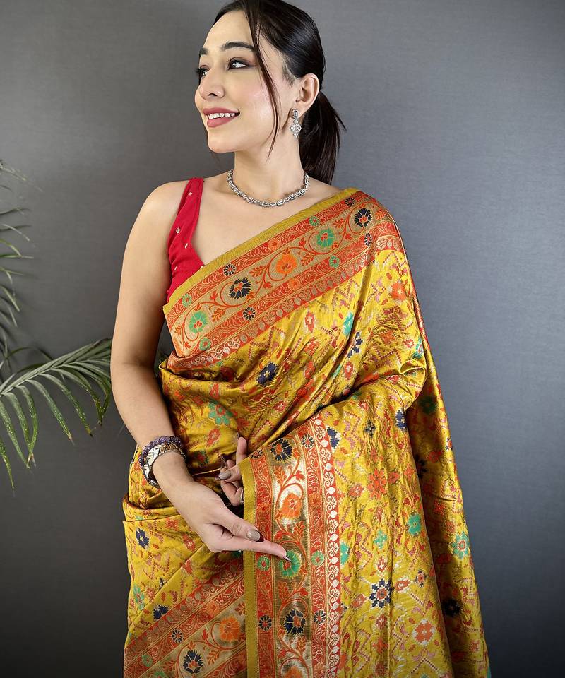 | Product Description | Step Into The Spotlight With The Elora Golden Yellow Soft Silk Banarasi Zari Woven Sareea Glow That Feels Like Sunshine Wrapped In Luxury. Crafted For Women Who Love Trending Women’s Ethnic Wear, This Saree Blends Soft Silk Comfort With Rich Banarasi Artistry. Its Shimmering Golden Hue Captures The Vibe Of Today’s Top Ranking Ethnic Styles On Mirraw, Making It A Must Have For Festive Glam, Wedding Sparkle, Or Any Moment You Want To Go Viral With Your Style. This Masterpiece Features Intricate Zari Weaving Inspired By The Timeless Charm Of Varanasi, Giving You That Perfect Mix Of Tradition And Trend. The Soft Silk Drape Feels Feather Light Yet Regal Just Like The Most Popular Banarasi Sarees Admired By Fashion Lovers Across India. Whether You're A Bride, Bridesmaid, Or Simply Dressing To Impress, This Bestseller Worthy Saree Instantly Elevates Your Ethnic Wardrobe With Its Cool, Classy, And Effortlessly Elegant Appeal. Pair It With Bold Jewelry, Soft Glam Makeup, And Your Confident Smile To Complete The Perfect Ethnic Moment. With Every Twirl, It Showcases The Iconic Craftsmanship That Makes Banarasi Designs Eternal Favorites In Women’s Ethnic Wear Bestsellers On Mirraw. If You’re Searching For A Saree That Is Stunning, Trending, And Made To Stand Out, The Elora Golden Yellow Soft Silk Banarasi Zari Woven Saree Is Your New Statement Piece Ready To Make Your Pictures Pop And Your Celebrations Shine. |