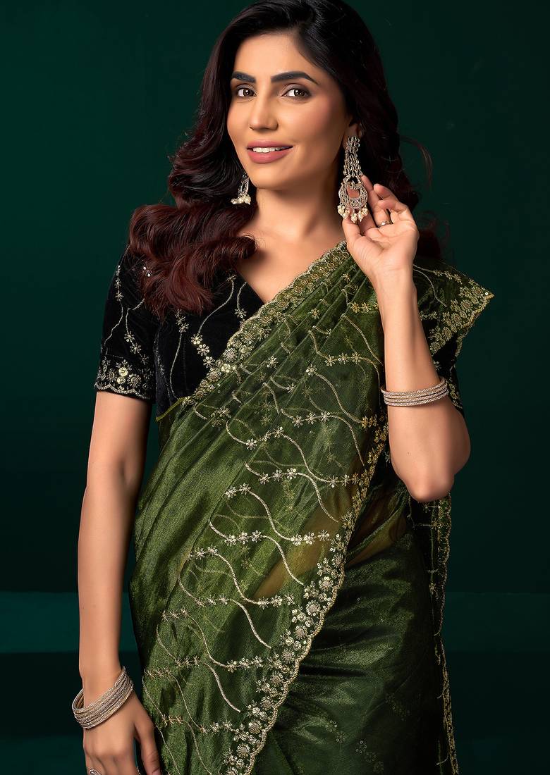 Green net jaal pattern sequence embroidery thread work party wear saree