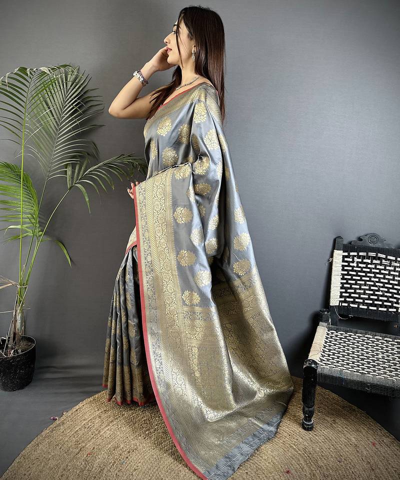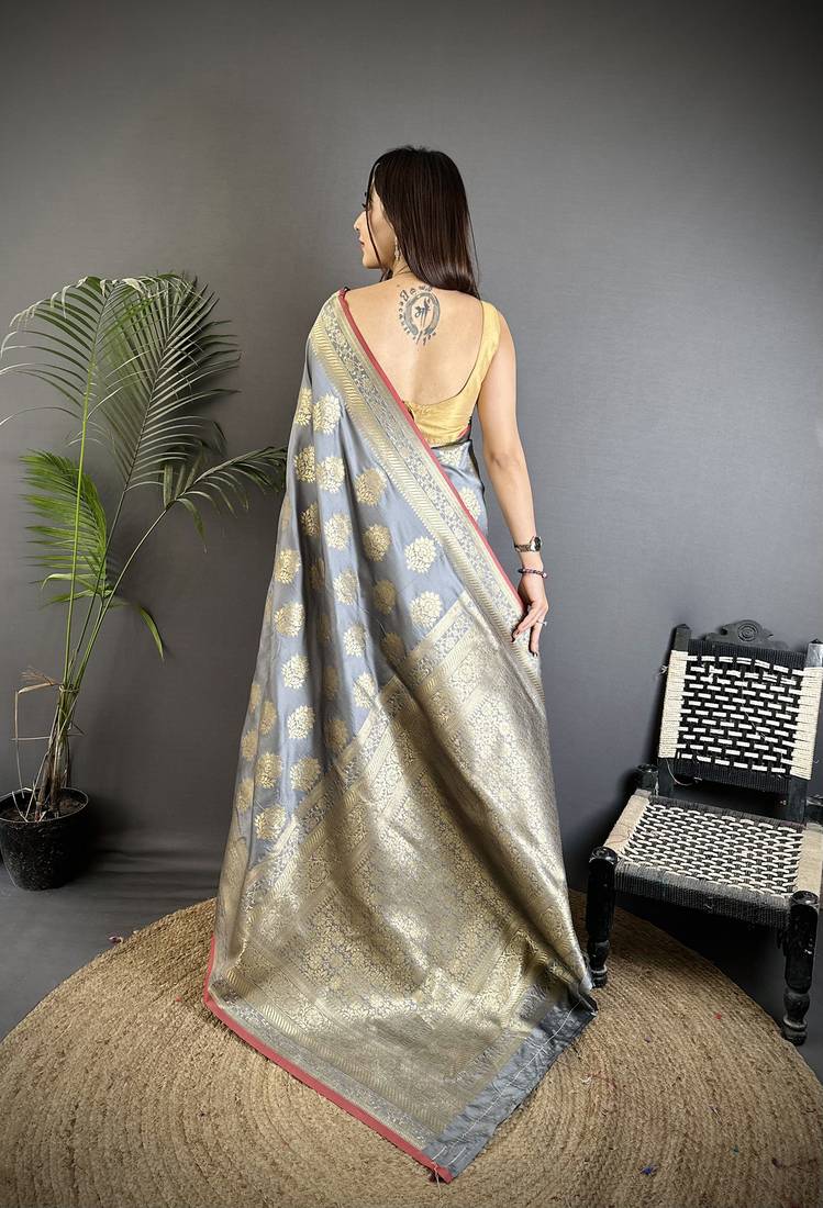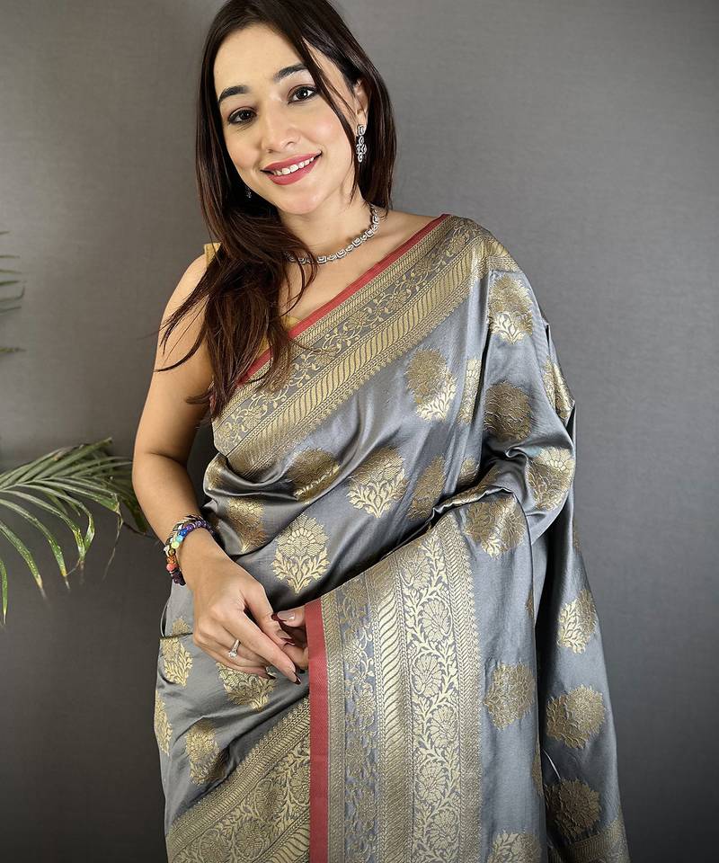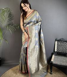Grey soft lichi silk blend ethnic floral motifs banarasi saree
