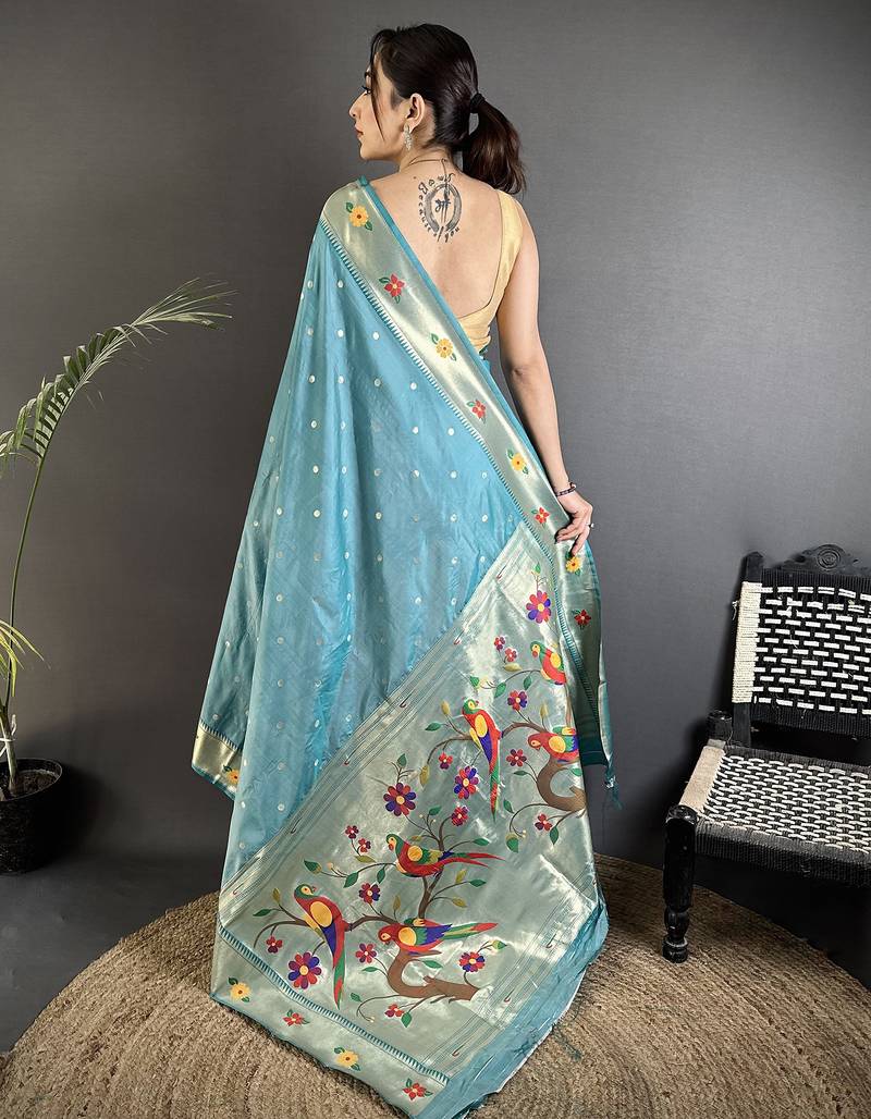 sky blue lichi silk blend parrot & floral woven design zari weaving paithani saree