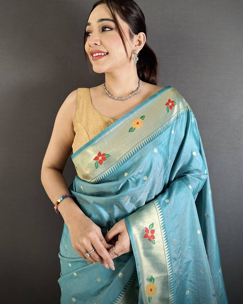 Ideal For Bridal Wear And Festive Gifting, This Traditional Paithani Silk Saree Blends Classic Artistry With Premium Quality. Enrich Your Ethnic Wardrobe With This Elegant Light Blue Silk Saree That Embodies Heritage, Beauty, And Timeless Tradition.