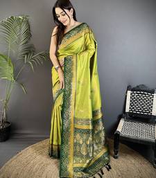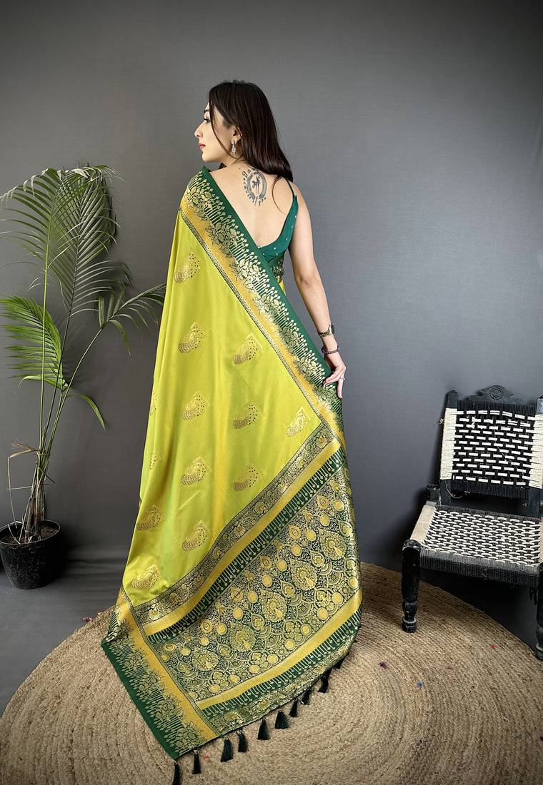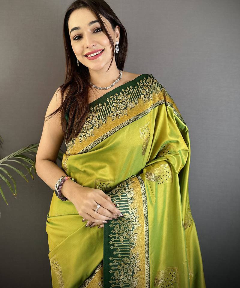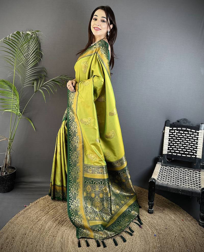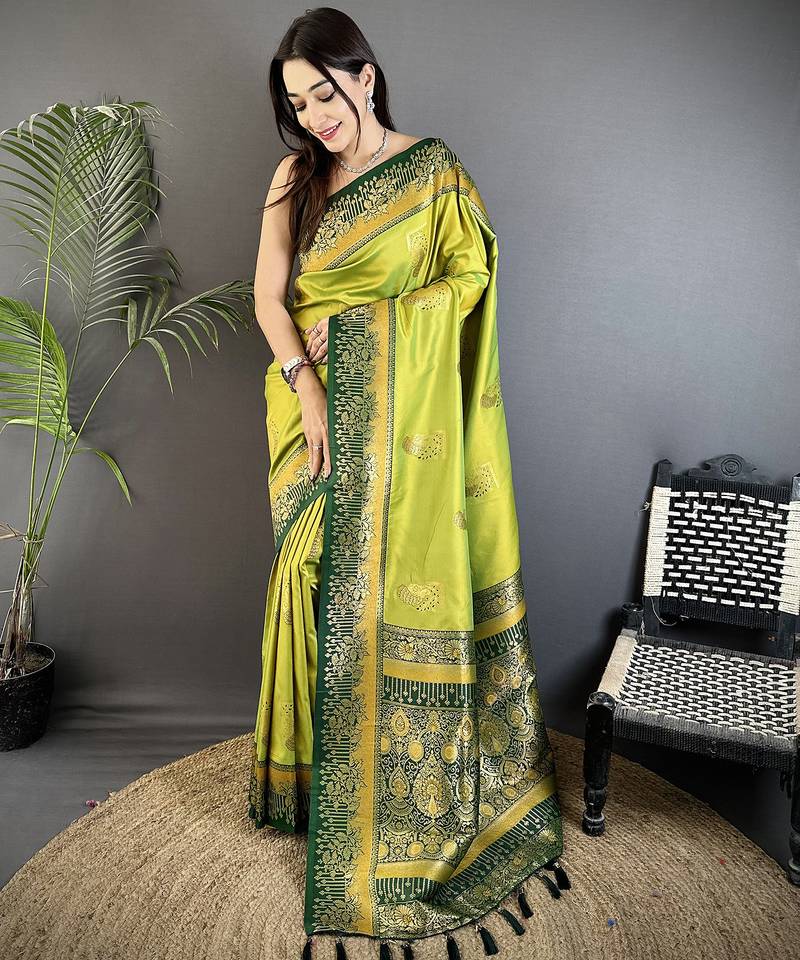 Light green soft silk blend dual zari peacock butta worked banarasi saree