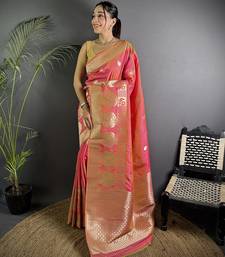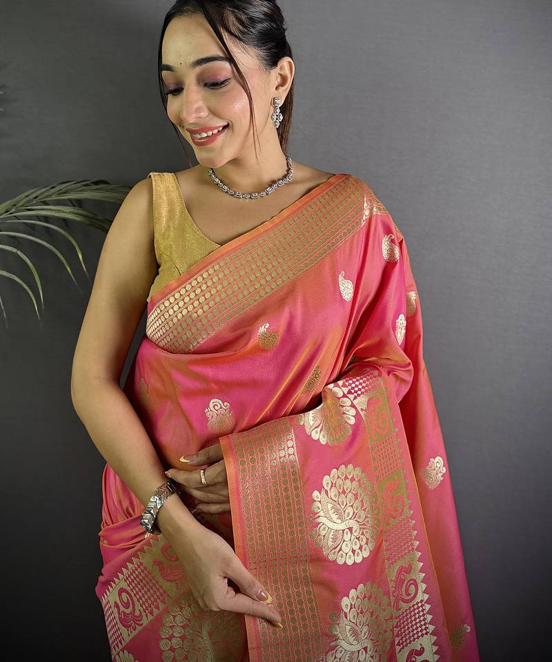 Light pink soft lichi silk blend golden zari paisley banarasi saree