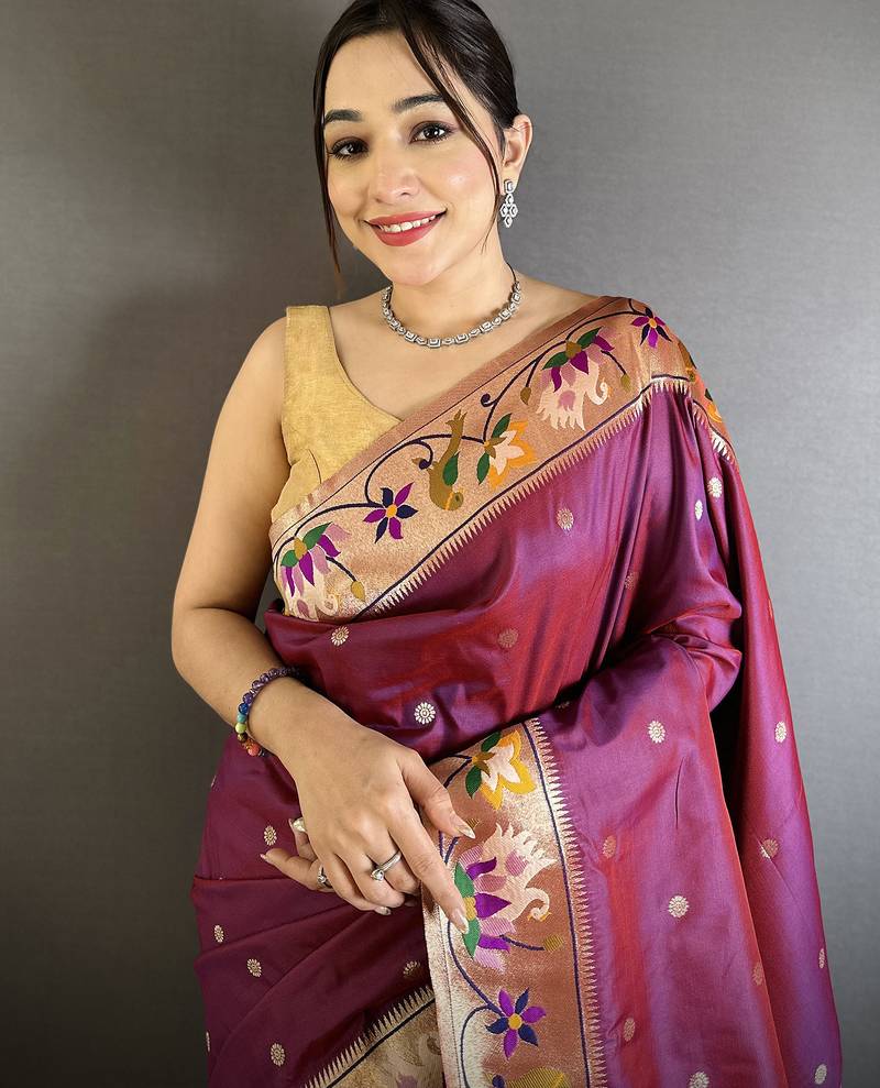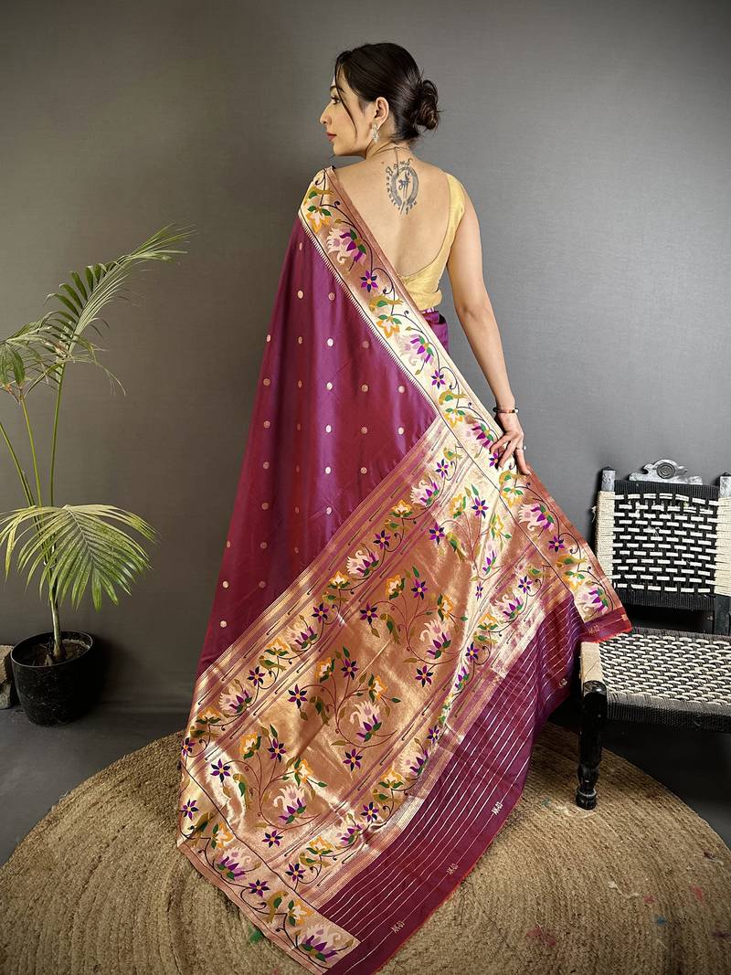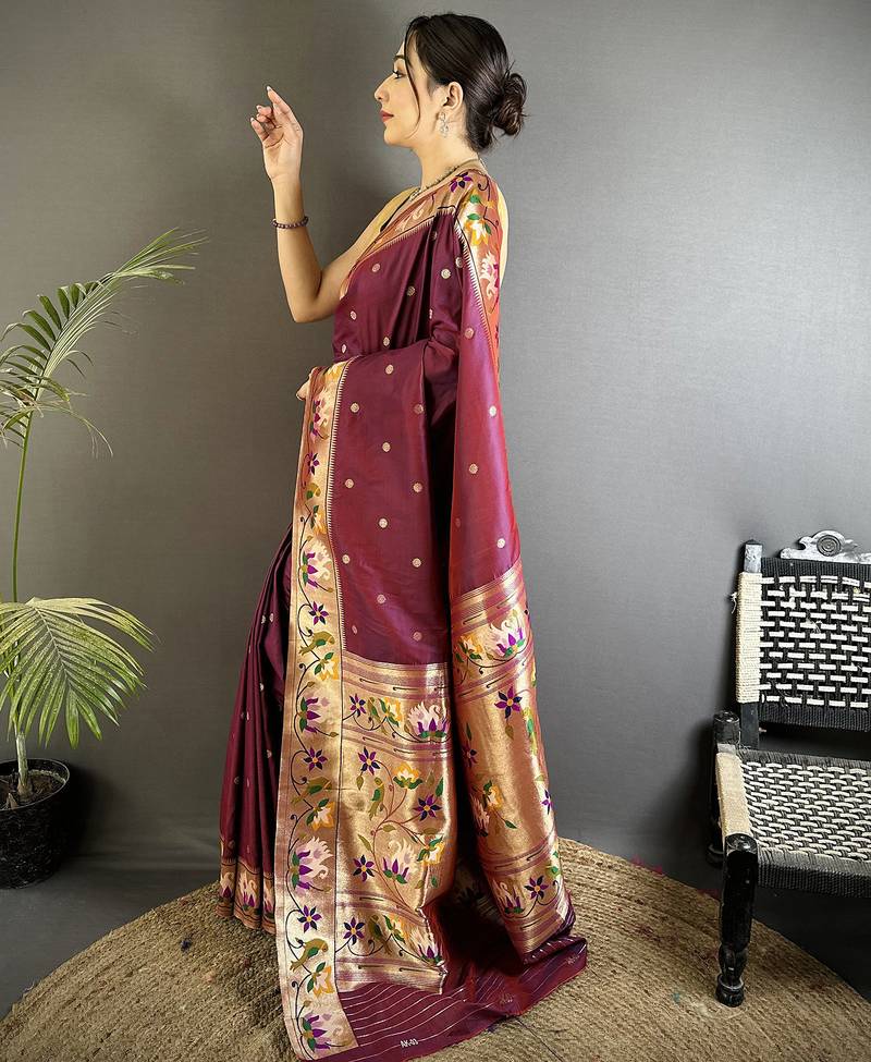Maroon lichi silk blend floral & meena weaving zari worked paithani saree