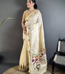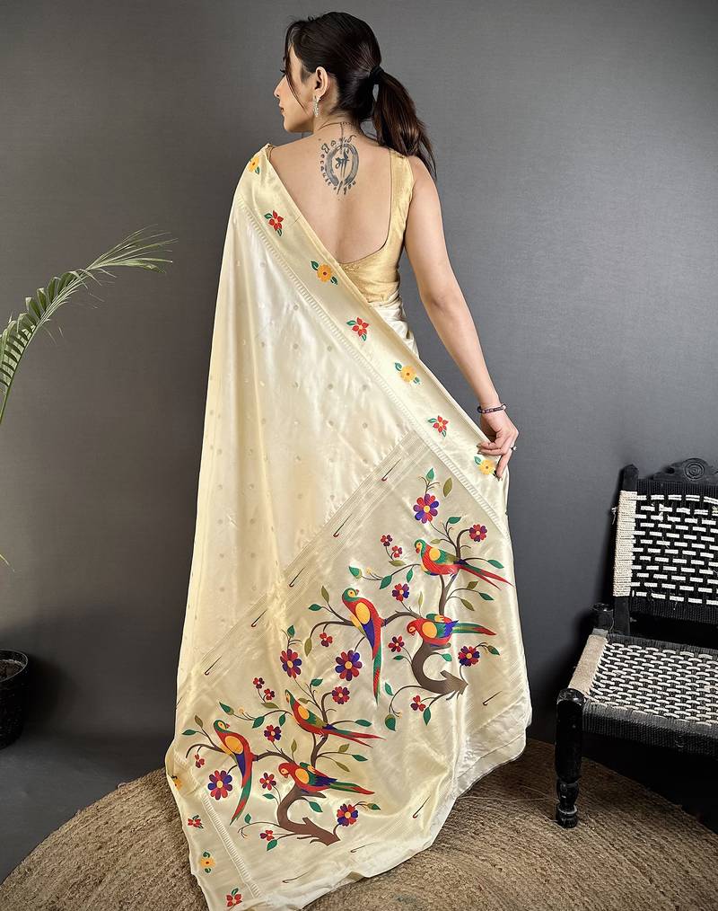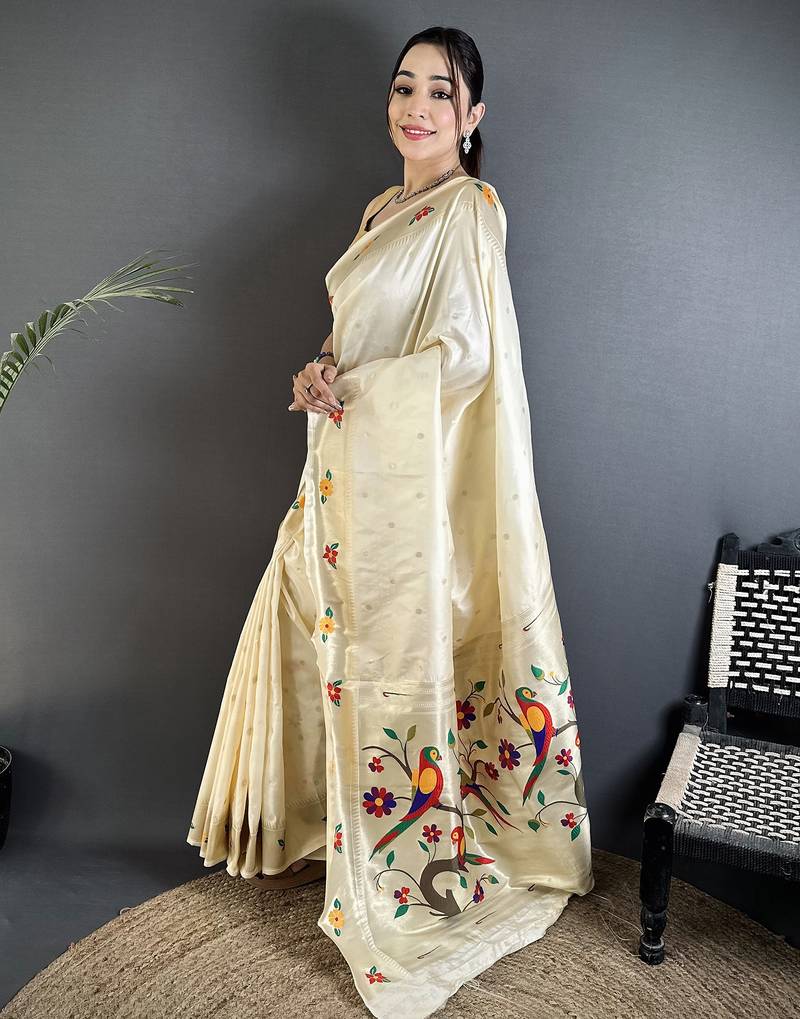 cream lichi silk blend parrot & floral woven design zari weaving paithani saree