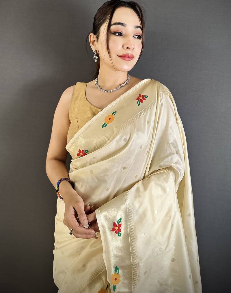An Ideal Pick For Bridal Trousseau And Festive Gifting, This Traditional Paithani Silk Saree Blends Heritage With Modern Style. Elevate Your Ethnic Wardrobe With This Stunning Off White Silk Saree That Reflects Luxury, Premium Quality, And Timeless Beauty.