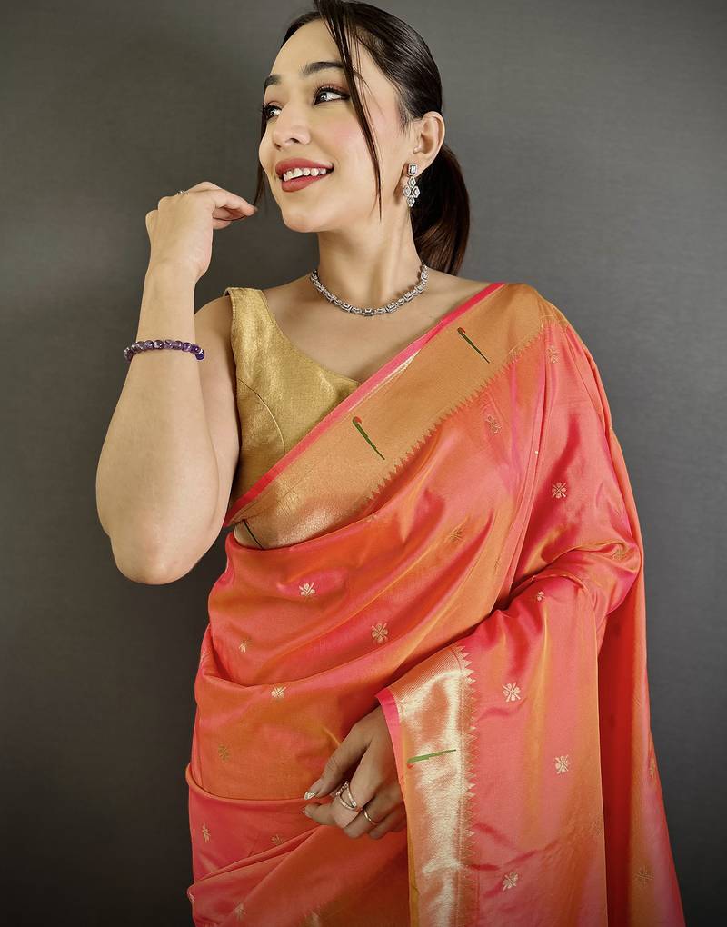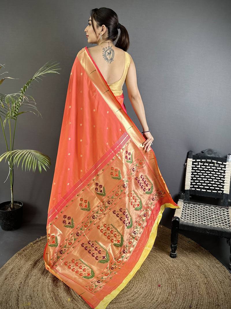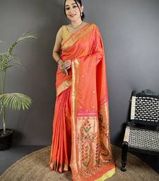 Orange lichi silk blend floral ikkat motifs zari weaving paithani saree