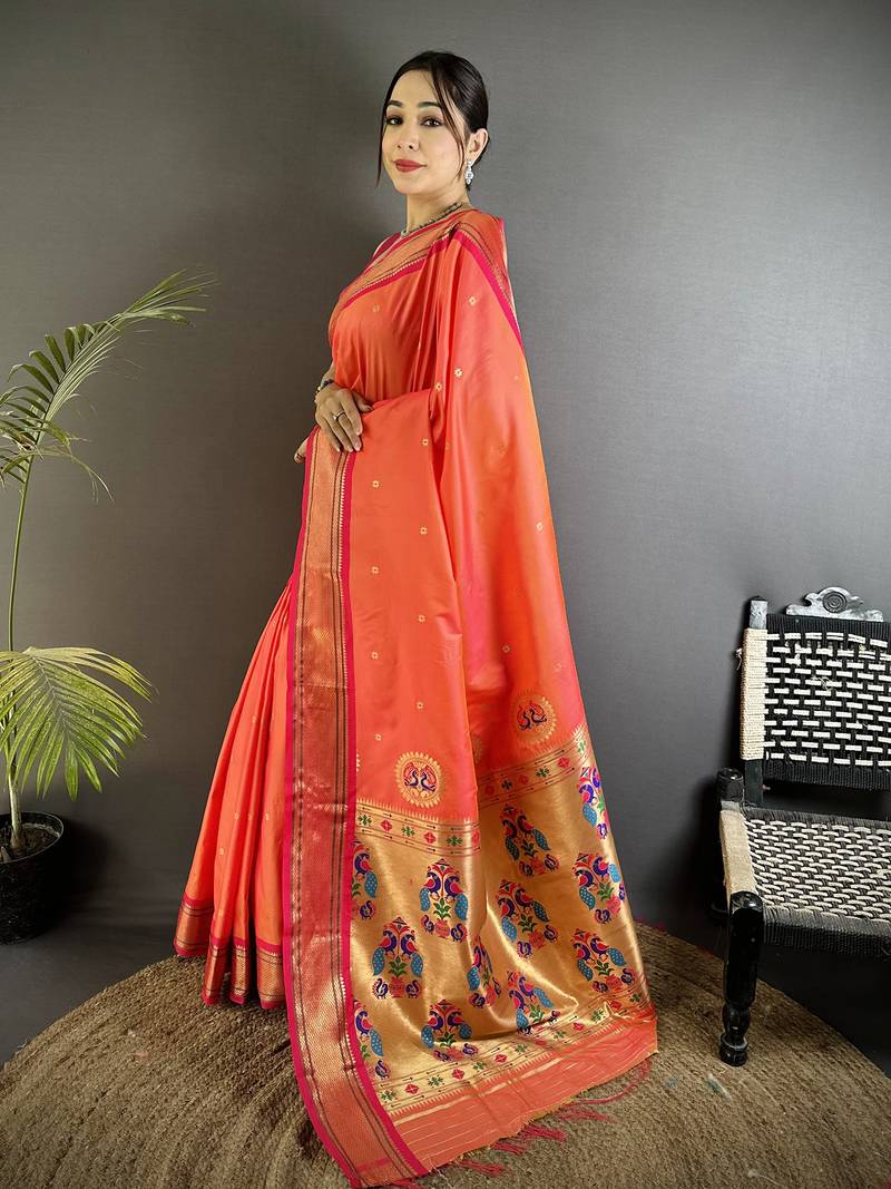 Orange lichi silk blend peacock ethnic motifs zari woven paithani saree