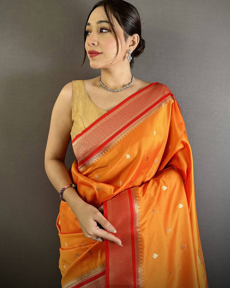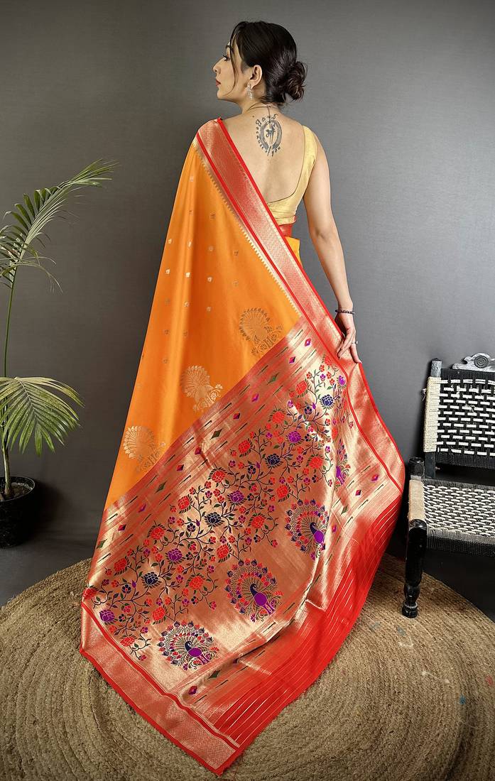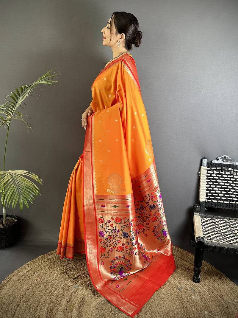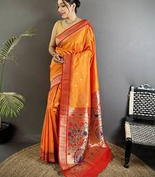Orange lichi silk blend peacock & floral motifs zari weaving paithani saree