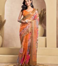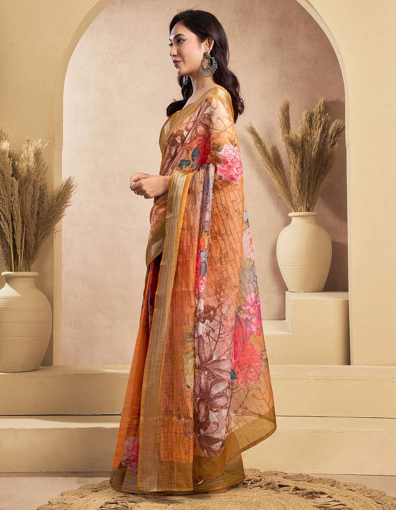 Orange linen floral motifs printed ready to wear saree