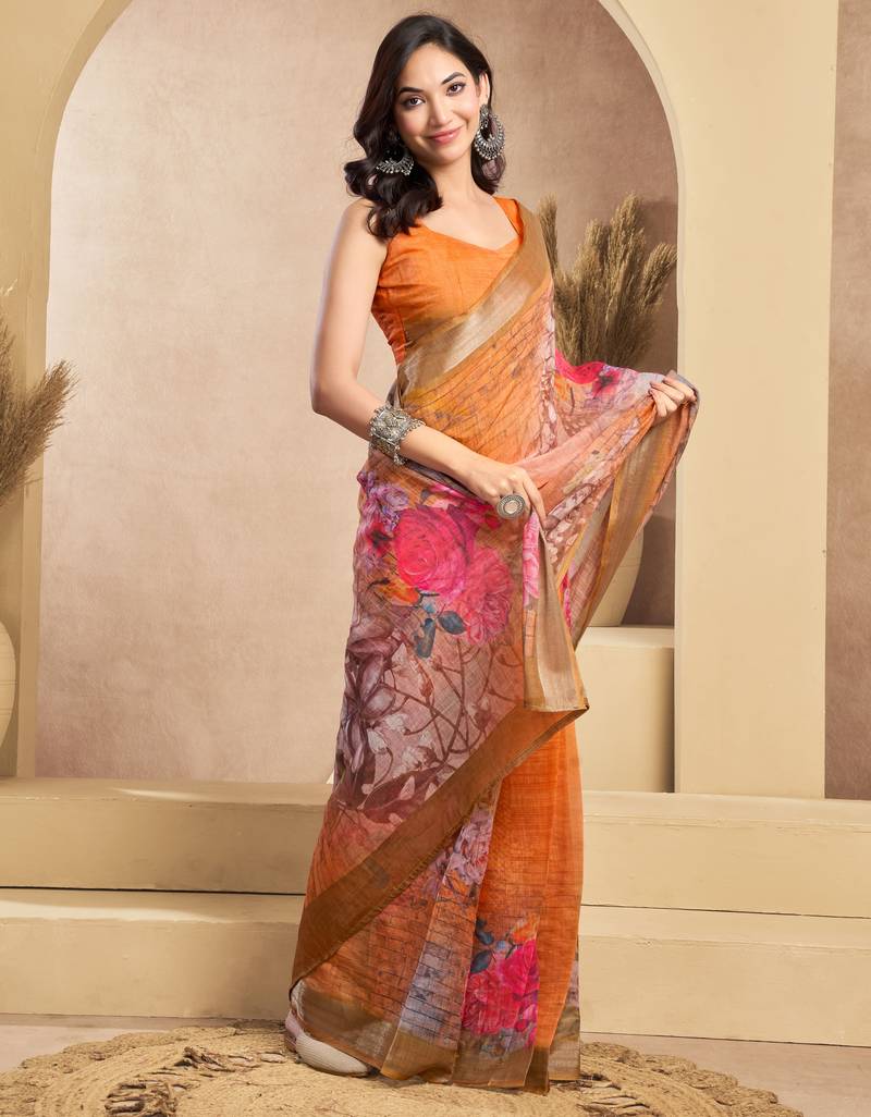 Product Name Orange Linen Floral Motifs Printed Ready To Wear Saree