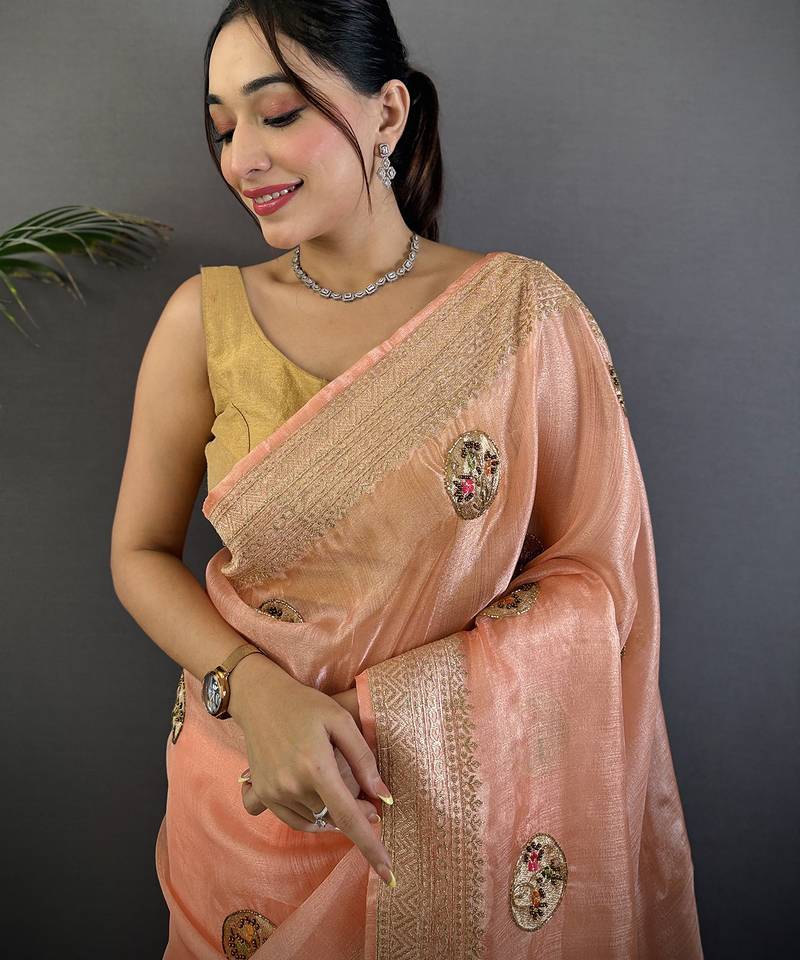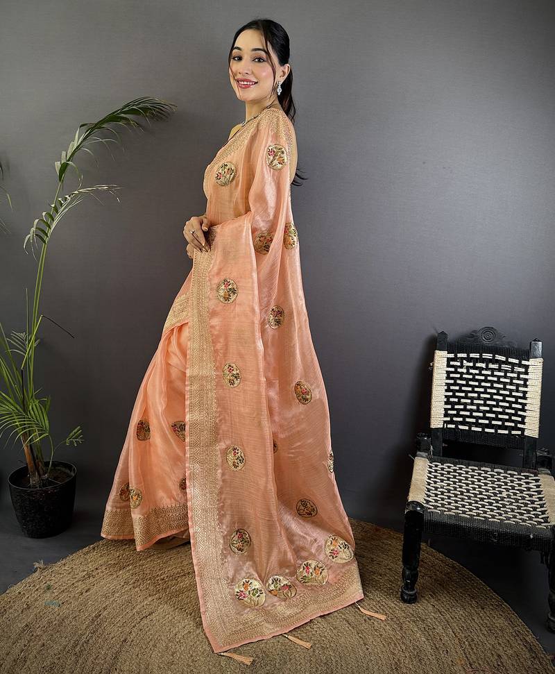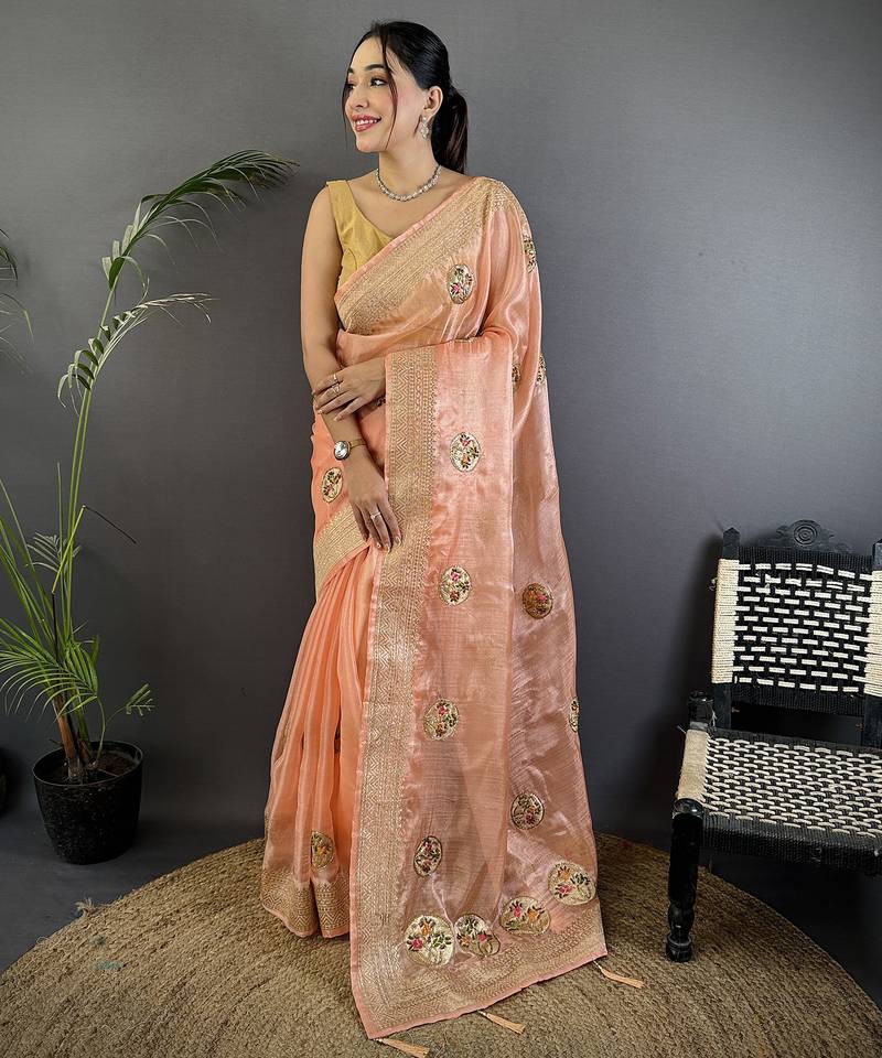 | Product Description | Glow Like Never Before In The Peach Organza Silk Saree, Where Handloom Heritage Meets Modern Elegance,A Perfect Blend Of Tradition And Contemporary Elegance. Crafted From Delicate Organza Silk, It Features Intricate Heavy Khatali Butta Work That Sparkles With Every Movement. A Top Ranking Favorite In Mirraw’s Women’s Ethnic Wear Collection, This Saree Is Ideal For Weddings, Festive Celebrations, Or Any Special Occasion Where Grace Meets Glamour.