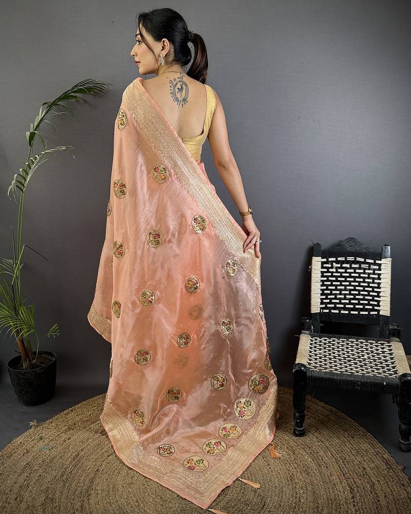 Peach organza silk blend handloom banarasi saree with heavy khatali butta work