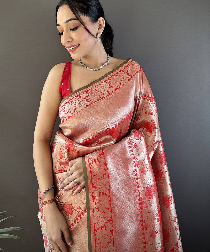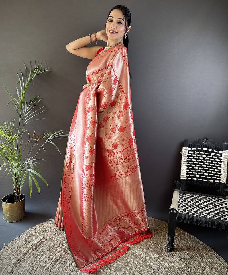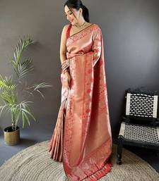 Peach soft banarasi silk blend flower jall zari weaving designer saree