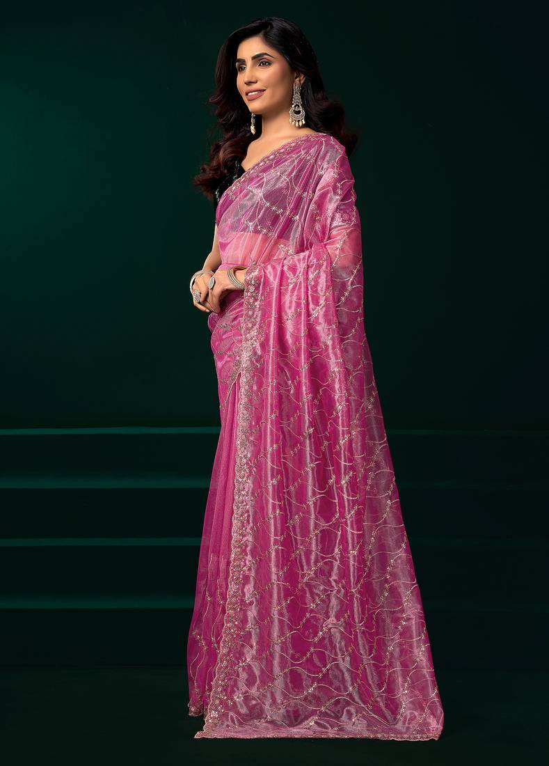 | Product Description | Glow In This Pink Net Saree Adorned With Intricate Jaal Pattern Sequence Embroidery. Perfect For Party Wear, The Delicate Thread Work Adds A Touch Of Elegance.