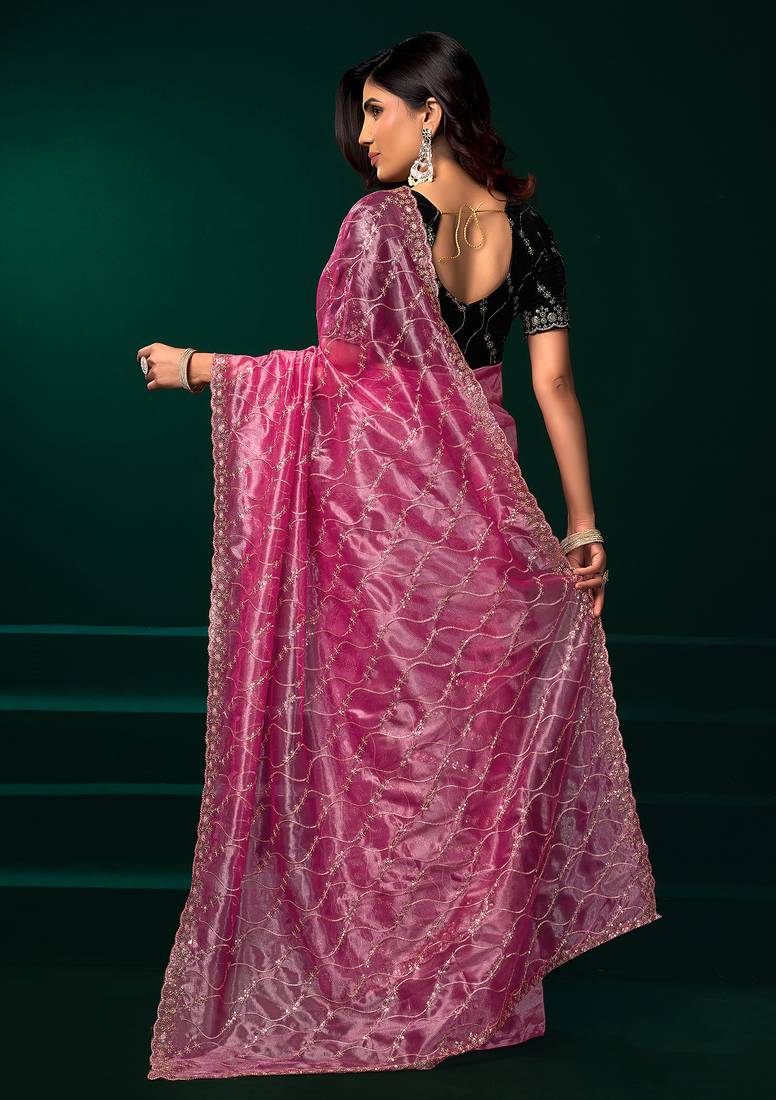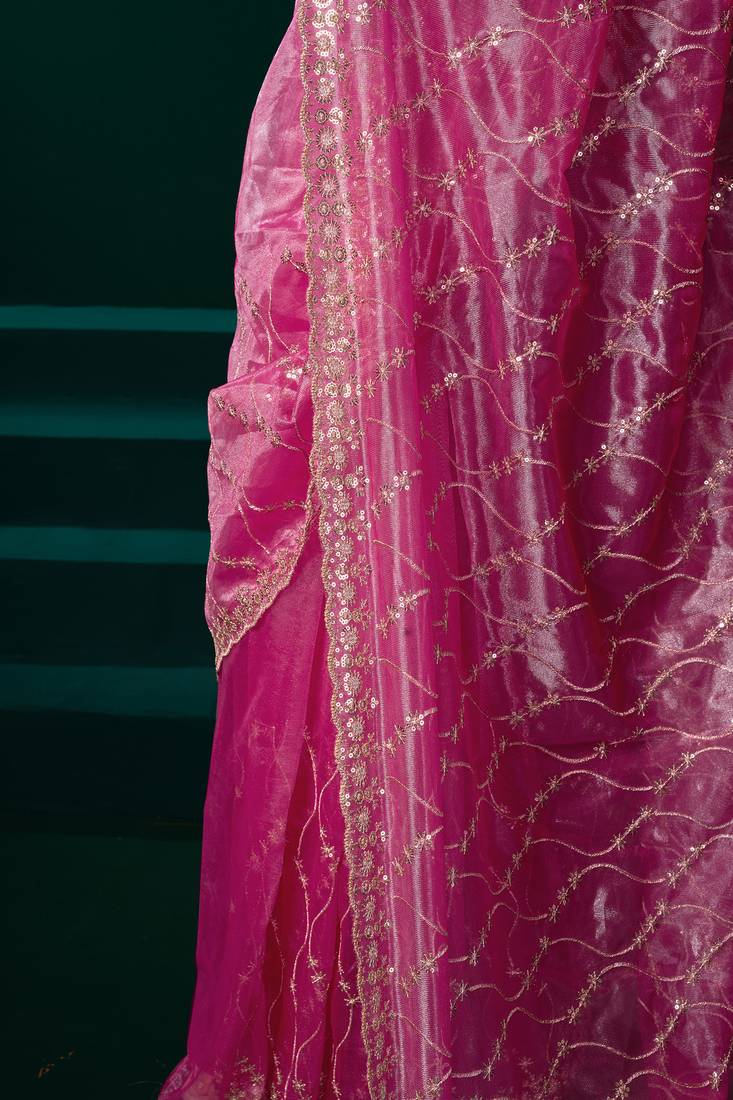 Pink net jaal pattern sequence embroidery thread work party wear saree