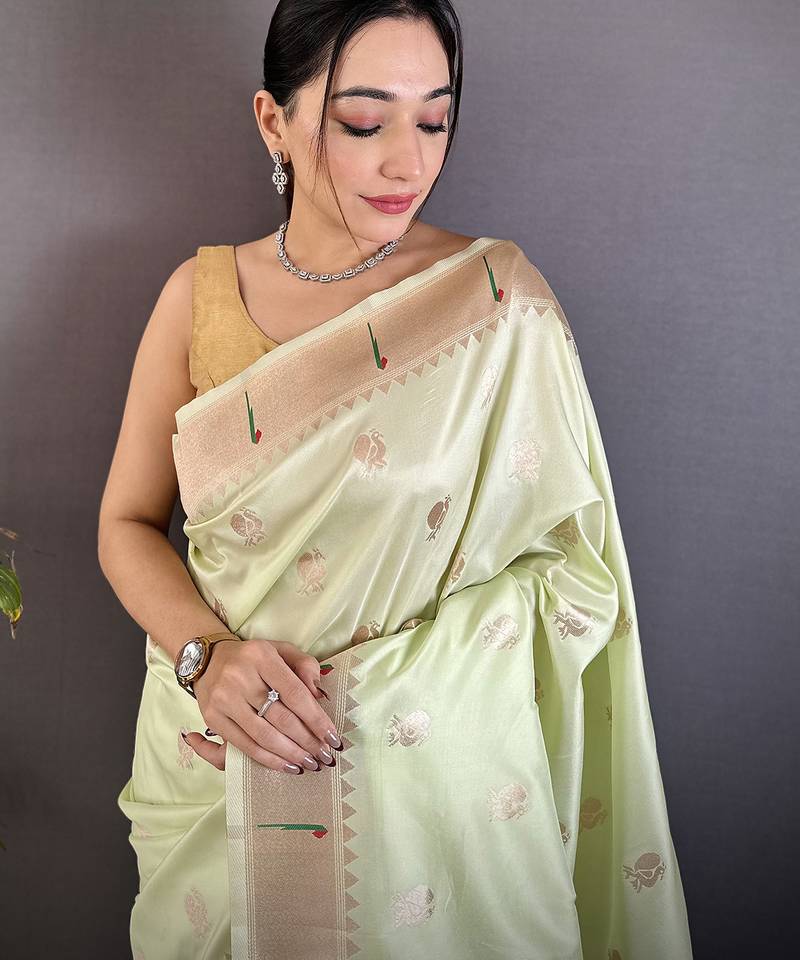 | Product Description | Step Into Charming Style With The Pista Green Soft Silk Peacock & Floral Zari Motifs Kanchipuram Saree A Trending Women’s Ethnic Wear Masterpiece That’s Lighting Up The Mirraw Home Page And Winning Hearts Everywhere. With Its Soothing Pista Green Shade And Classic Peacock & Floral Zari Motifs Woven In Rich Soft Silk, This Saree Blends Timeless Tradition With Fresh Personality. It’s No Surprise That This Piece Is Ranked Among The Most Popular Women’s Ethnic Styles For Weddings, Festive Celebrations, And All Your Instagram‑Worthy Moments. Every Drape Feels Graceful, Every Step Feels Confident, And Every Angle Feels Made For Pictures.