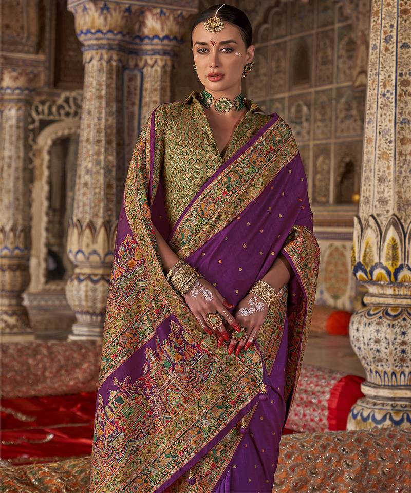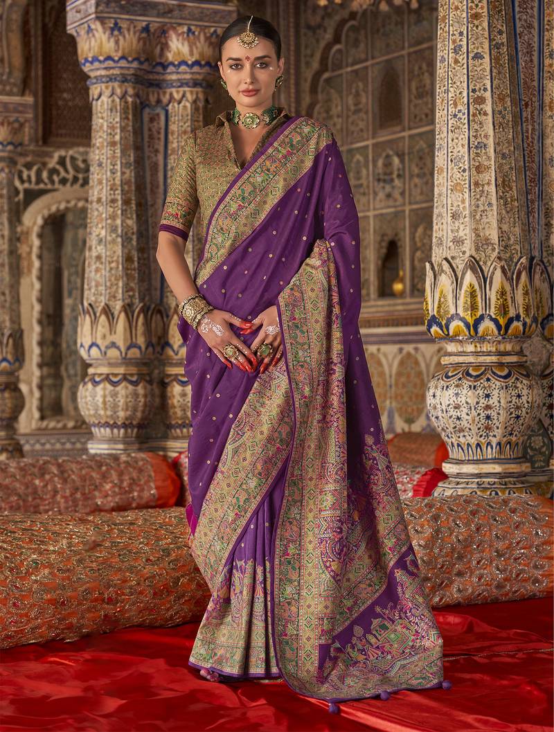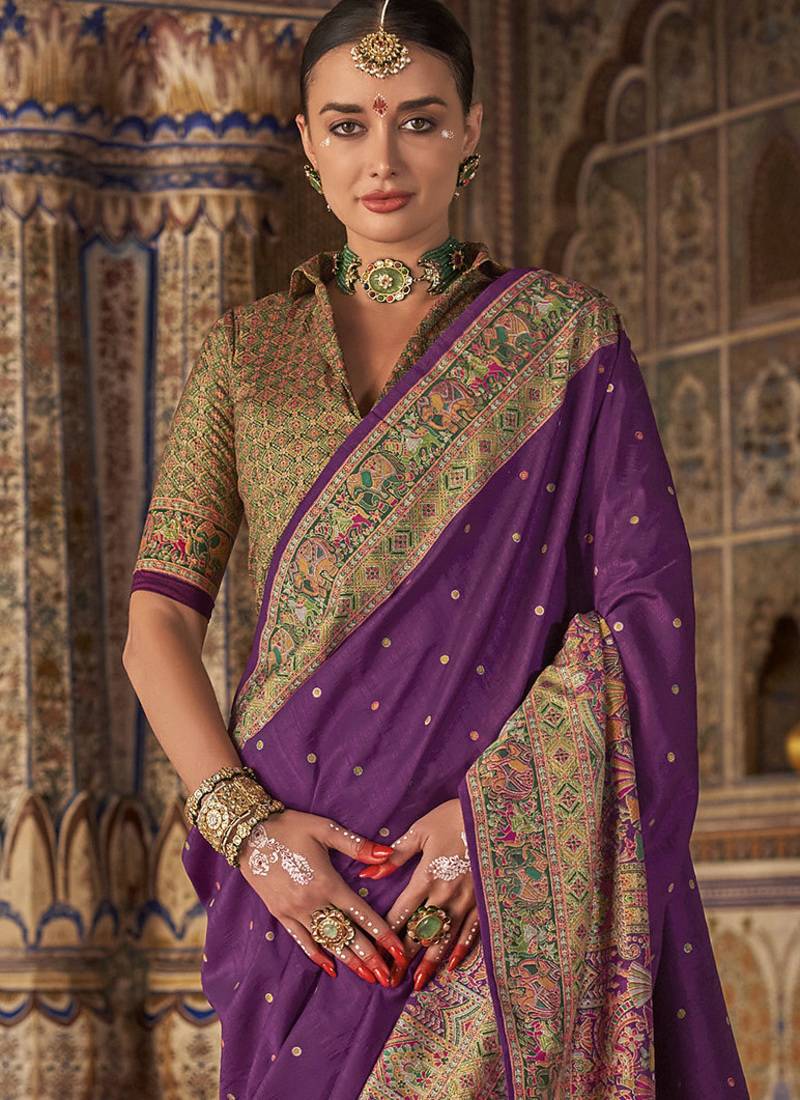 Pair This Purple Banarasi Silk Saree With Gold Or Silver Accessories To Elevate Your Style For Celebrations, Receptions, Or Cultural Gatherings. Its Elegant Drape, Vibrant Finish, And Timeless Detailing Make It Perfect For Women Seeking Designer Sarees With Lasting Appeal.