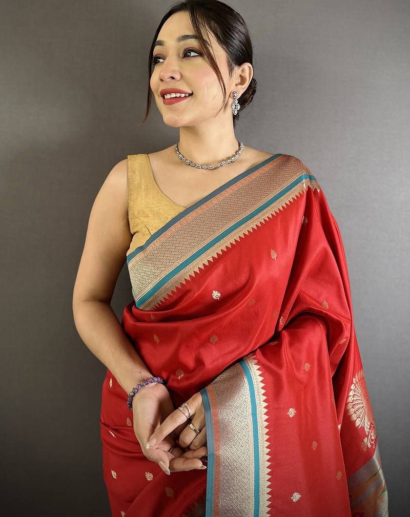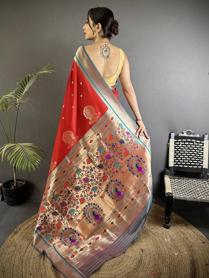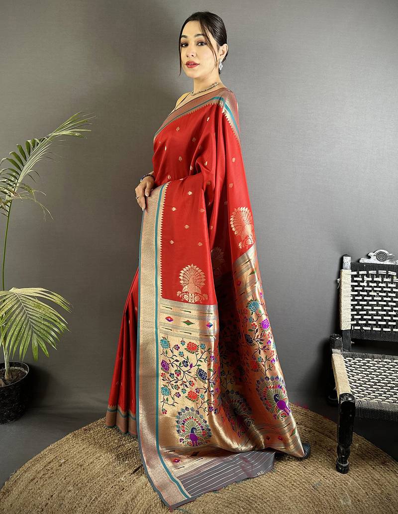 Red lichi silk blend peacock & floral motifs zari weaving paithani saree