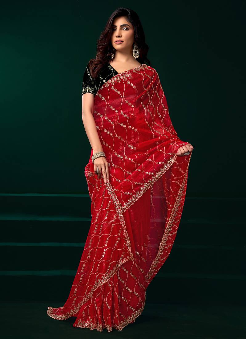 | Product Description | Step Into Elegance With This Red Net Saree, Adorned With Intricate Jaal Pattern Sequence Embroidery. Ideal For Party Wear, The Detailed Thread Work Enhances Every Festive Look.