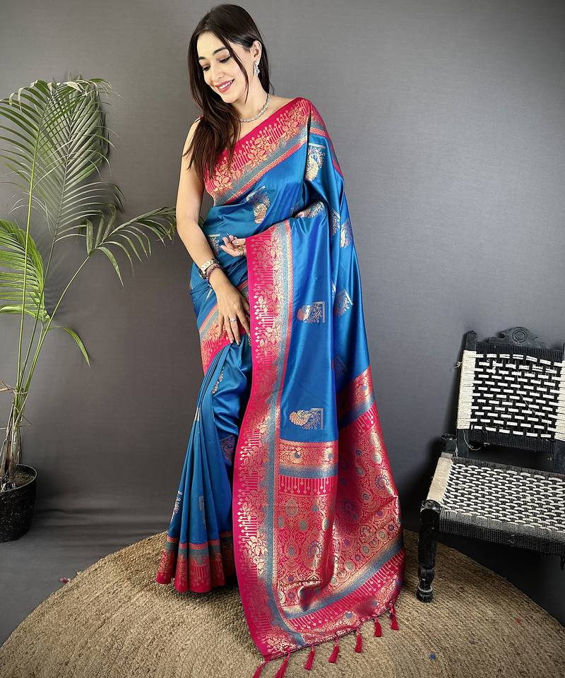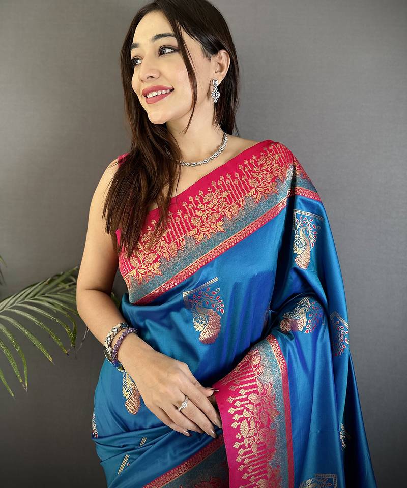 | Product Description | Turn Heads And Steal The Spotlight With The Royal Blue Soft Silk Banarasi Saree, A Stunning Blend Of Tradition And Contemporary Charm. Woven In Luxuriously Soft Silk, It Glimmers With Dual Zari Work While The Intricate Peacock Butta Motifs Add A Royal Touch. Perfect For Weddings, Festive Celebrations, Or Special Occasions, This Saree Is A Top Ranking Women’s Ethnic Wear That Belongs On Every Fashion Savvy Woman’s Wardrobe. From The Home Page To Trending Collections, It’s A Must Have For Those Who Love Elegance With A Modern Twist.