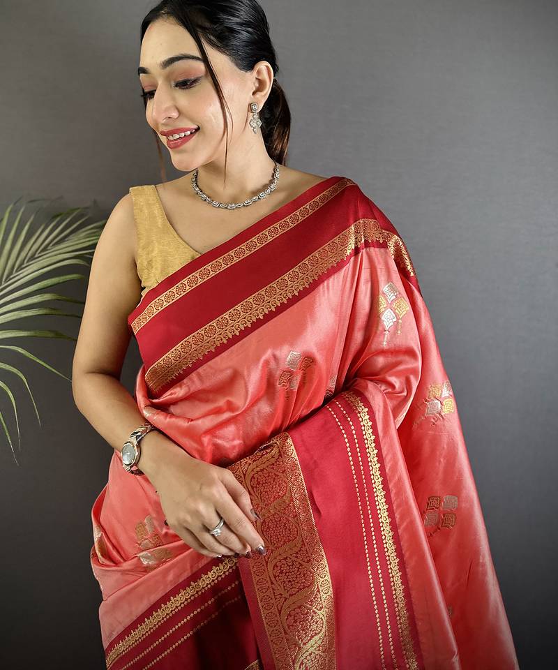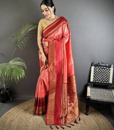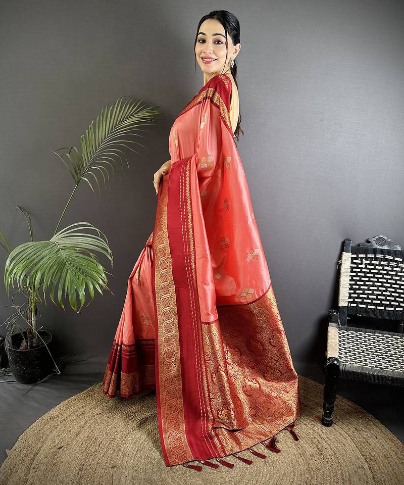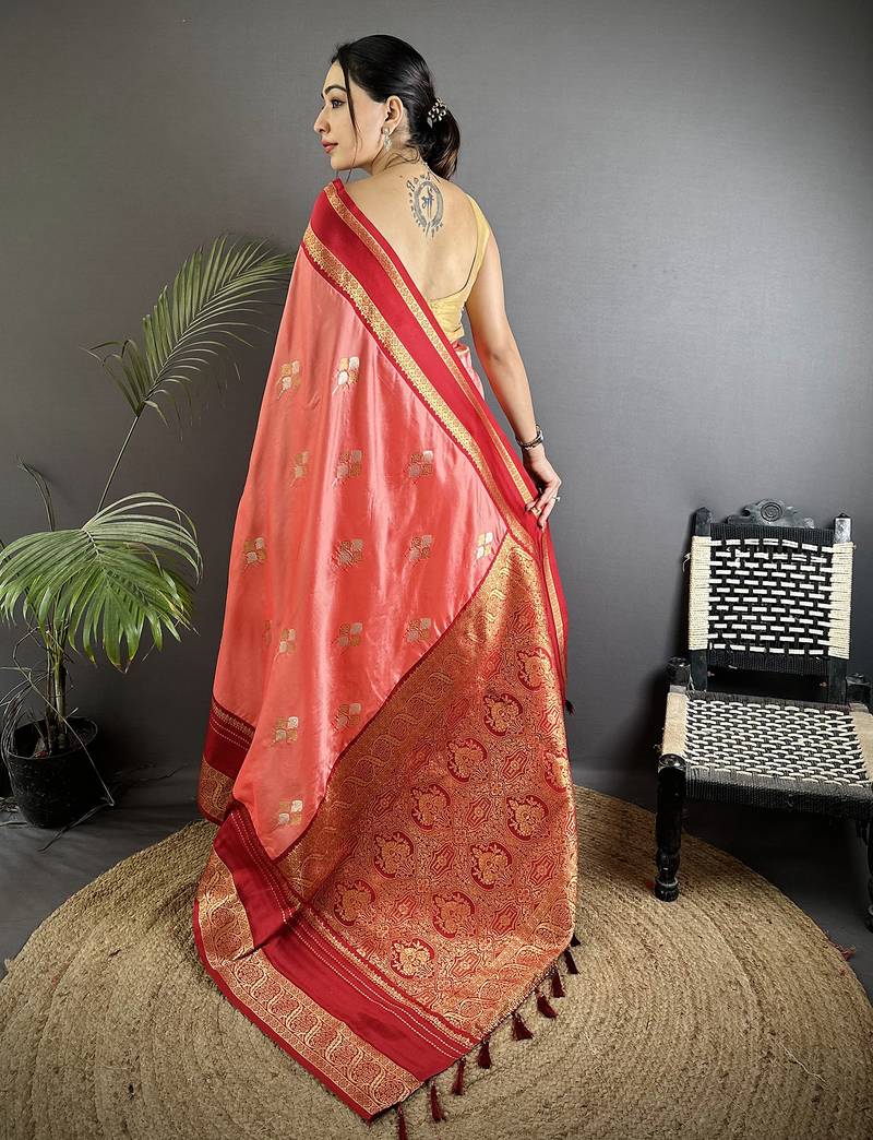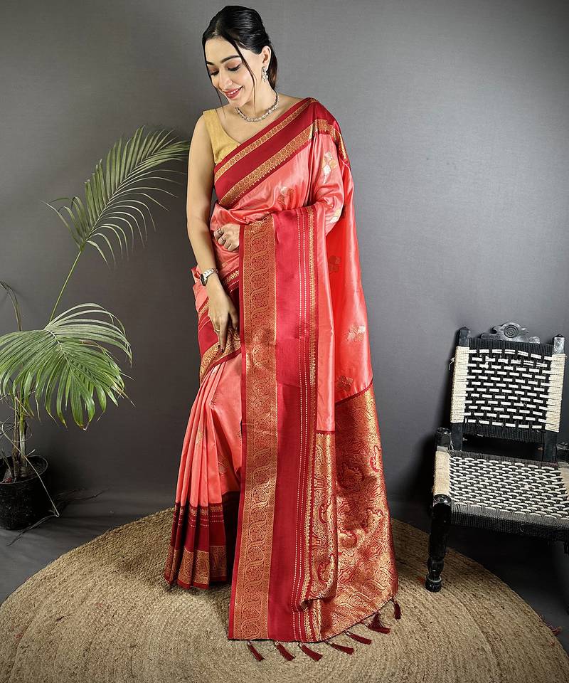 Salmon pink soft silk blend woven dual zari work banarasi saree