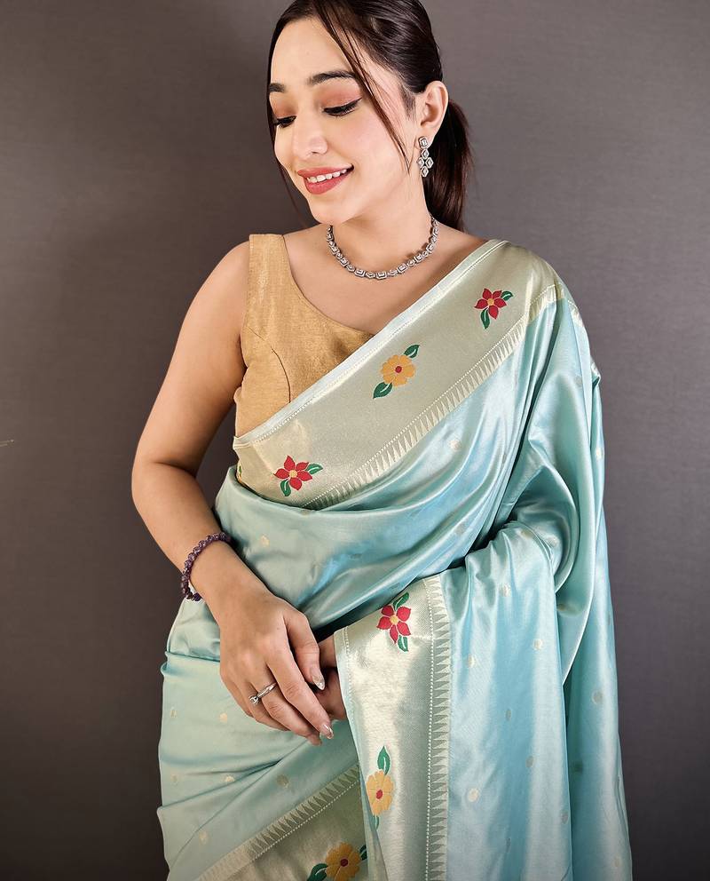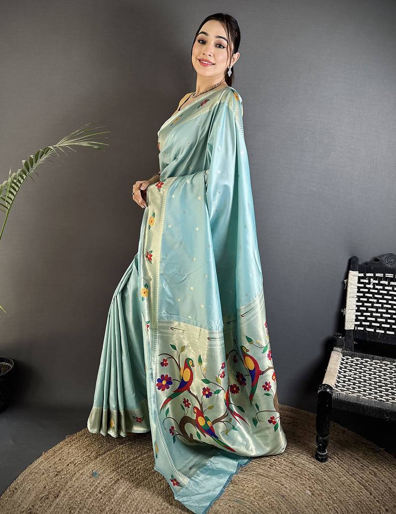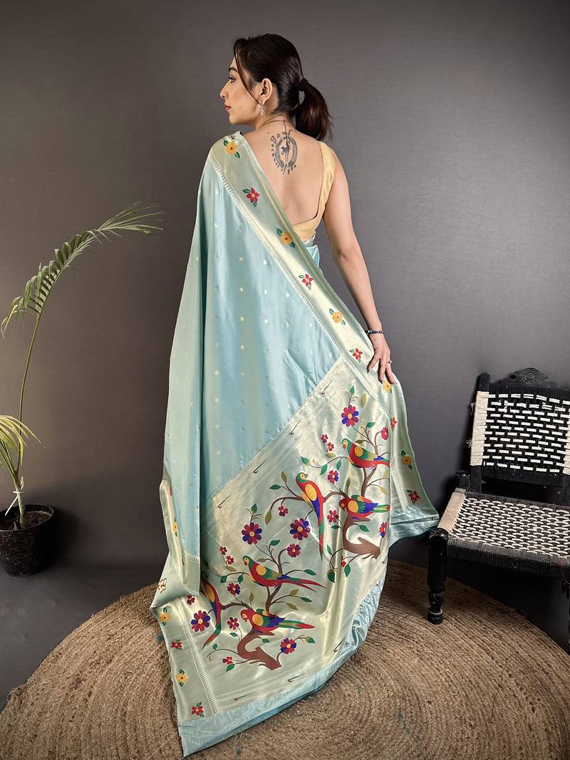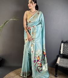 Sky blue lichi silk blend parrot & floral woven design zari weaving paithani saree