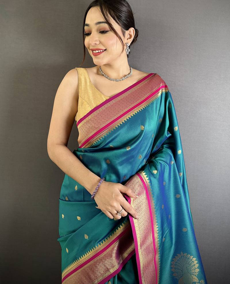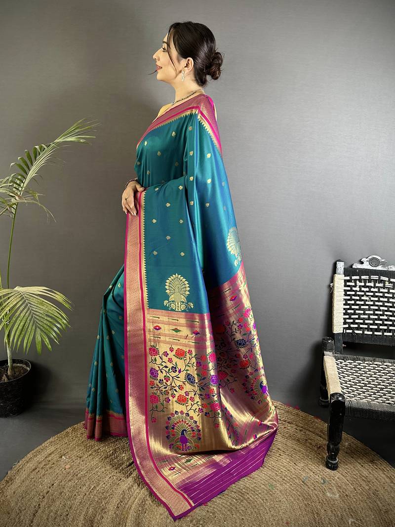 Teal lichi silk blend peacock & floral motifs zari weaving paithani saree